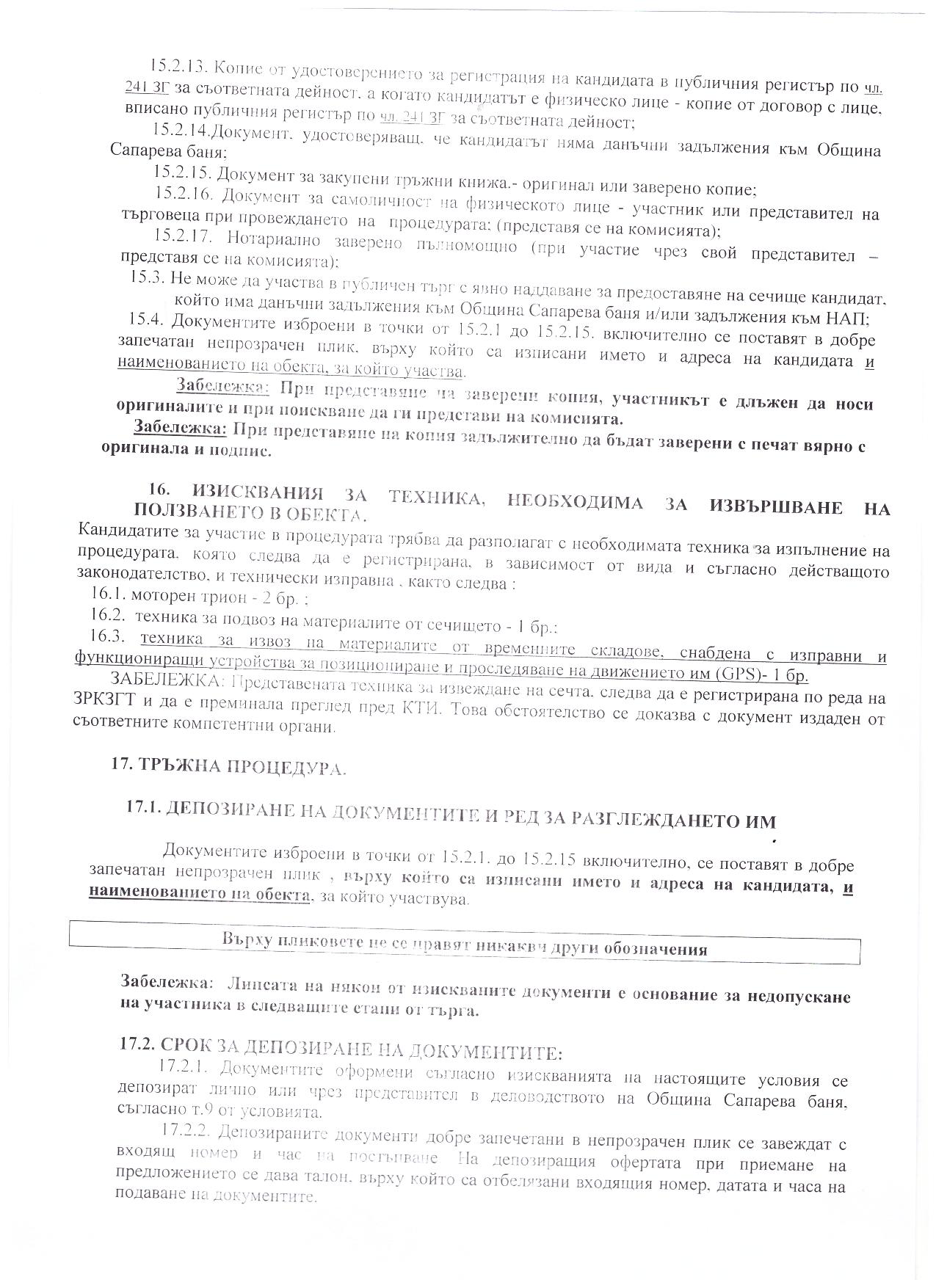Тръжна документация може да получите от деловодството на Община Сапарева баня при предварително внесена сума от 120,00 лева с ДДС за тръжната документация по набирателна сметка на Община Сапарева баня: Уникредит груп клон гр. Сапарева баня, BIC: UNCRBGSF IBAN: BG55UNCR 96608497667812 вид плащане: 447000 всеки работен ден от 09.00 до 16.00 часа до 25/02/2016 г. включително. Документация за повторния търг може да получите в деловодството на Община Сапарева баня до 16.00 часа на 07/03/2015 г. при предварително внесена сума за тръжната документация.