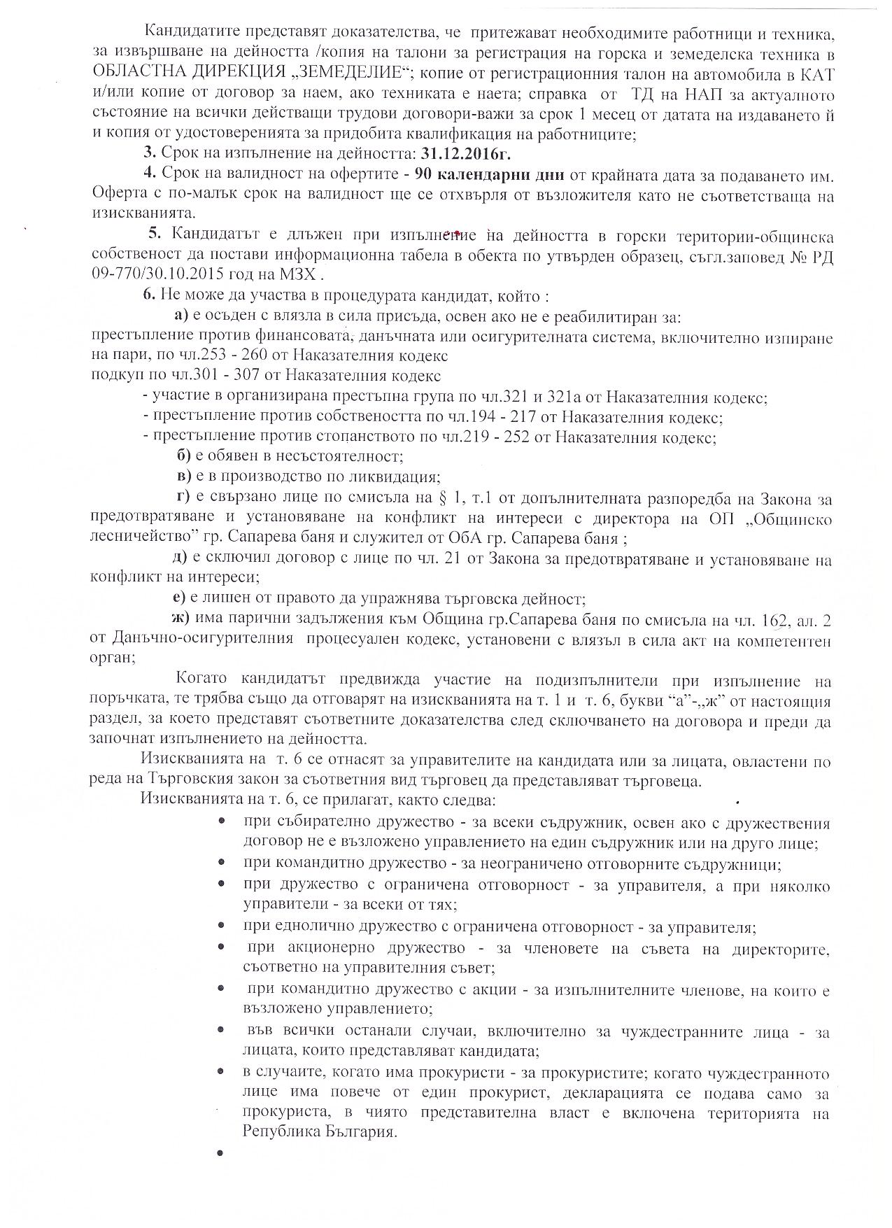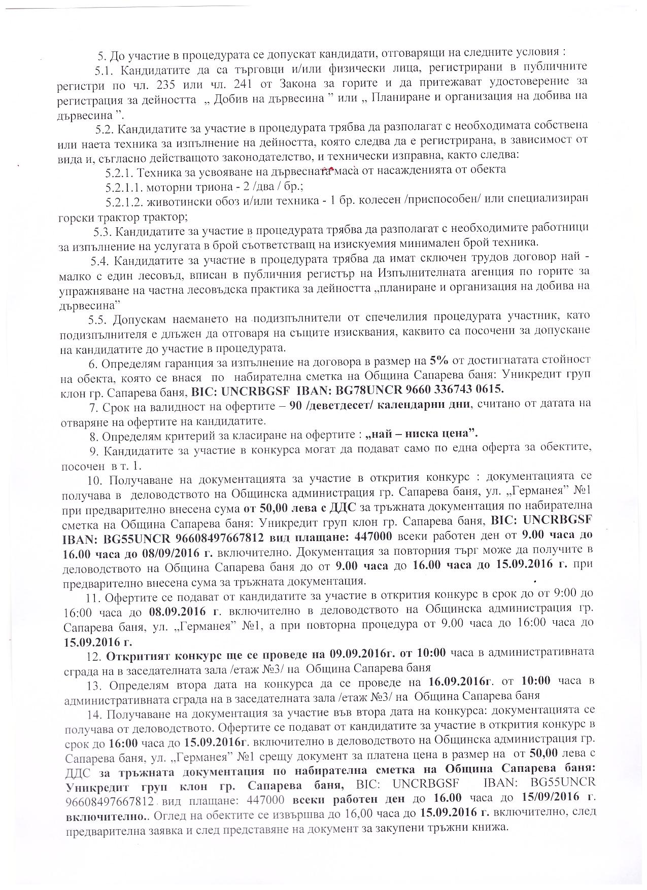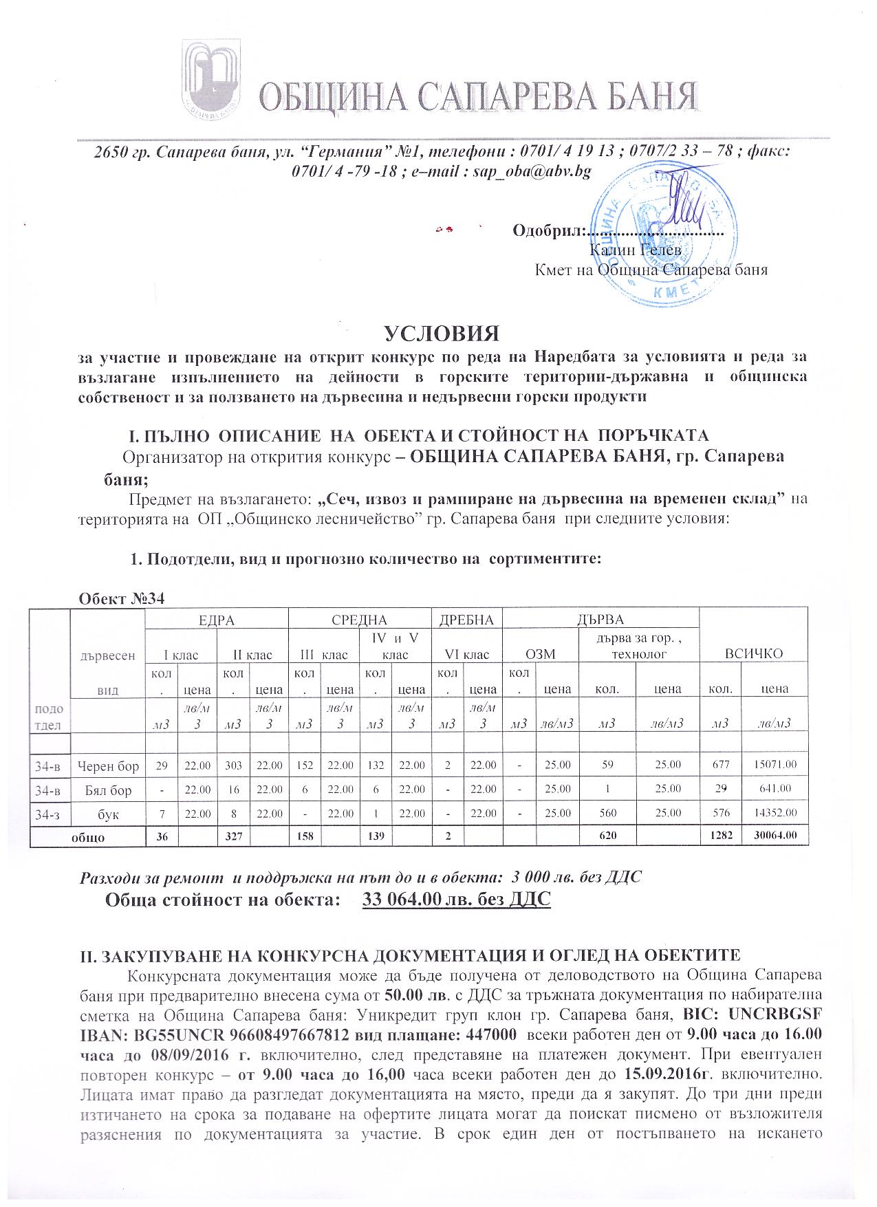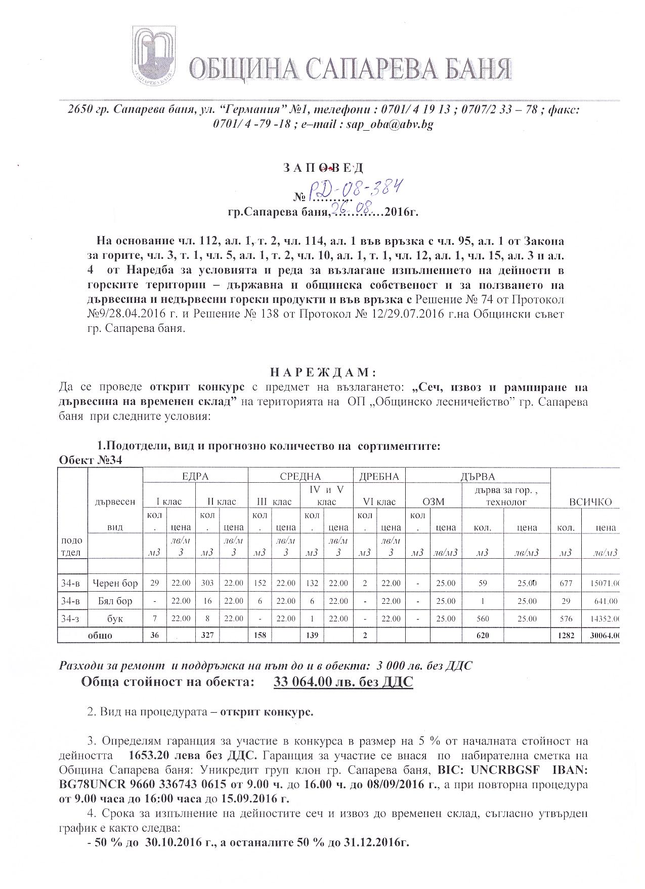На основание чл.44, .1, т.1 и т.7, .2 от ЗМСМА; чл. 10, ал.1, т. 1; чл.15, ал.3 и ал. 4 от Наредба за условията и реда за възлагане изпълнението на дейности в горските територии - държавна и общинска собственост, и за ползването на дървесина и недървесни горски продукти;   Решение № 74 от Протокол №9/28.04.2016 г.; Решение №138 от Протокол №12/29.07.2016г.на Общински съвет гр. Сапарева баня  и Заповед № РД-08-384/26.08.2016 год. на Кмета на Община Сапарева баня се организира открит конкурс за възлагане на дейност извършване на добив, представляващ сеч, разкройване и извоз до временен горски склад и почистване на сечище в Обект № 034, отдели 34-в, 34-з от общинския горски фонд на територията на Община Сапарева баня
