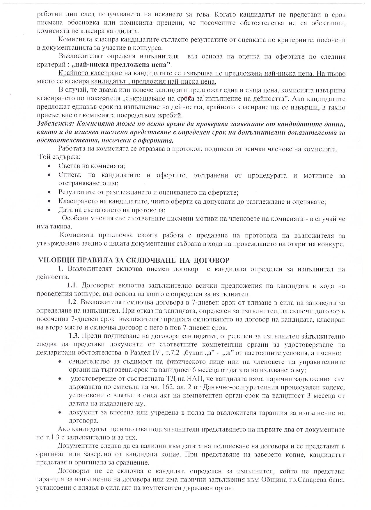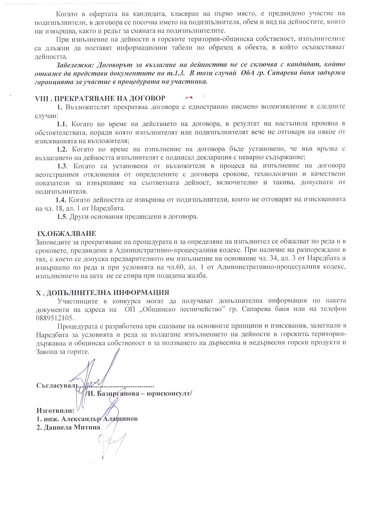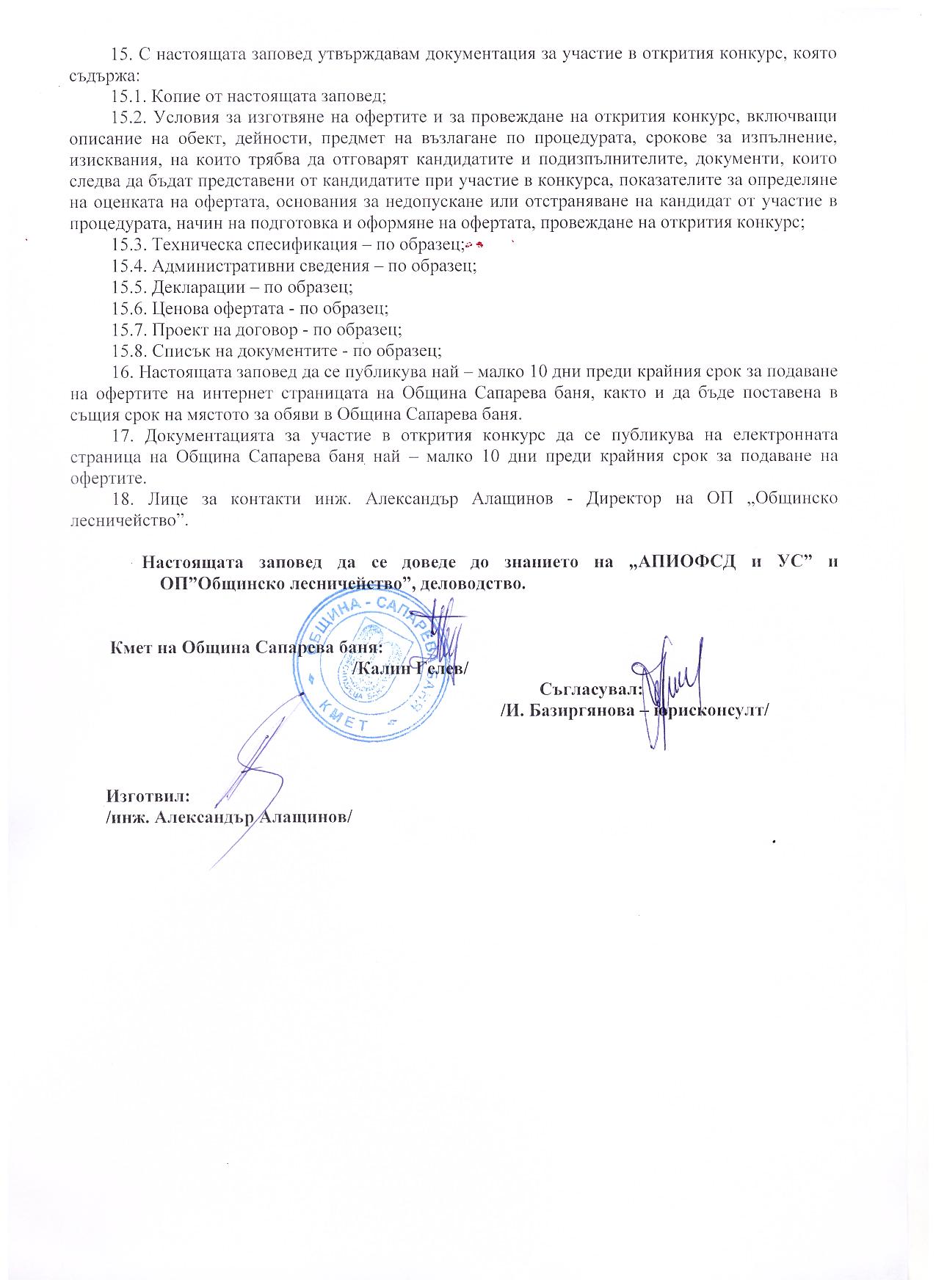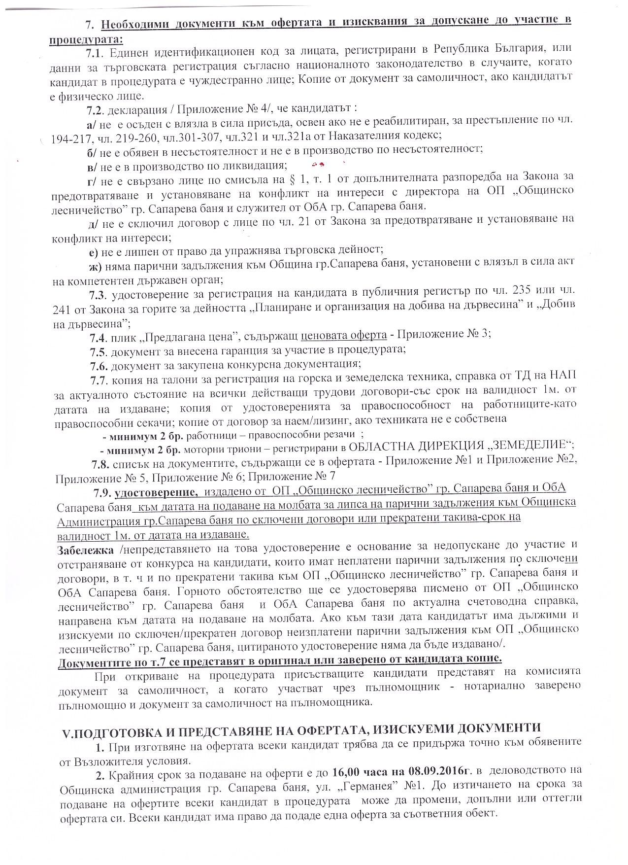 На основание чл.44, .1, т.1 и т.7, .2 от ЗМСМА; чл. 10, ал.1, т. 1; чл.15, ал.3 и ал. 4 от Наредба за условията и реда за възлагане изпълнението на дейности в горските територии - държавна и общинска собственост, и за ползването на дървесина и недървесни горски продукти;   Решение № 74 от Протокол №9/28.04.2016 г.; Решение №138 от Протокол №12/29.07.2016г.на Общински съвет гр. Сапарева баня  и Заповед № РД-08-384/26.08.2016 год. на Кмета на Община Сапарева баня се организира открит конкурс за възлагане на дейност извършване на добив, представляващ сеч, разкройване и извоз до временен горски склад и почистване на сечище в Обект № 034, отдели 34-в, 34-з от общинския горски фонд на територията на Община Сапарева баня