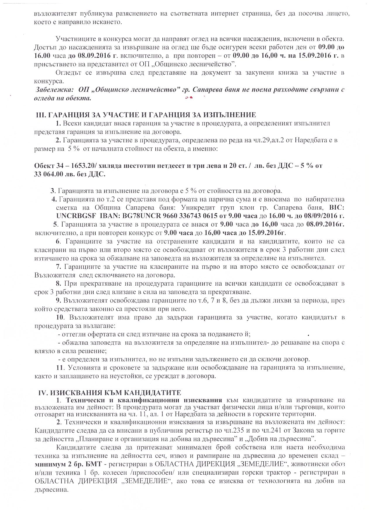 3.1.Гаранция за участие за обект 034 отдел 34-в, 34-з - 5% от началната цена 33 064.00 лв. без ДДС или  1653.20 лева без ДДС. Гаранция за участие се внася  по  набирателна сметка на Община Сапарева баня: Уникредит груп клон гр. Сапарева баня, BIC: UNCRBGSF  IBAN: BG78UNCR 9660 3367430615  до 16.00 ч. на 08/09/2016 г.
