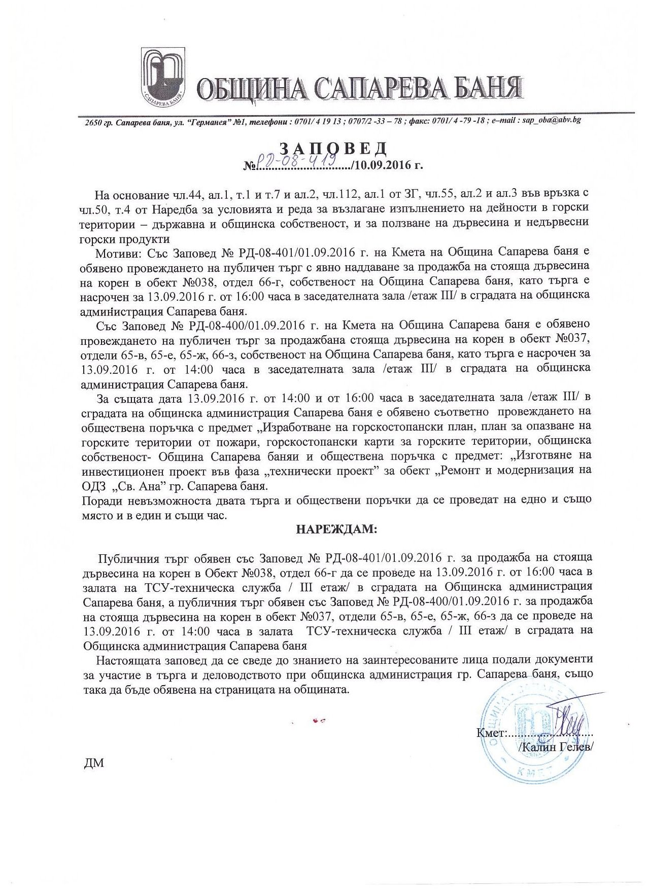 Заповед №РД-08- 419/ 10.09. 2016г. на кмета на община Сапарева баня за промяна мястото на провеждане на търгове, обявени със Заповед № РД-08-400/01.09.2016 год. и Заповед РД-08-401/01.09.2016 г.
