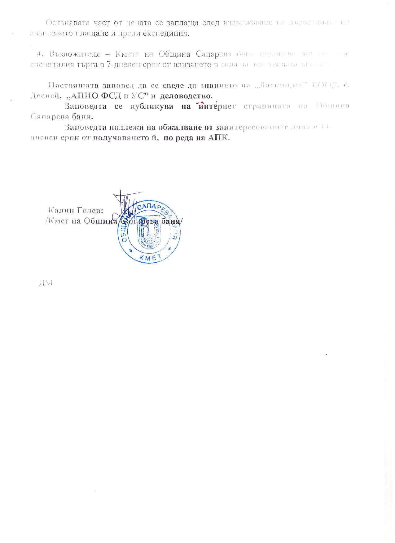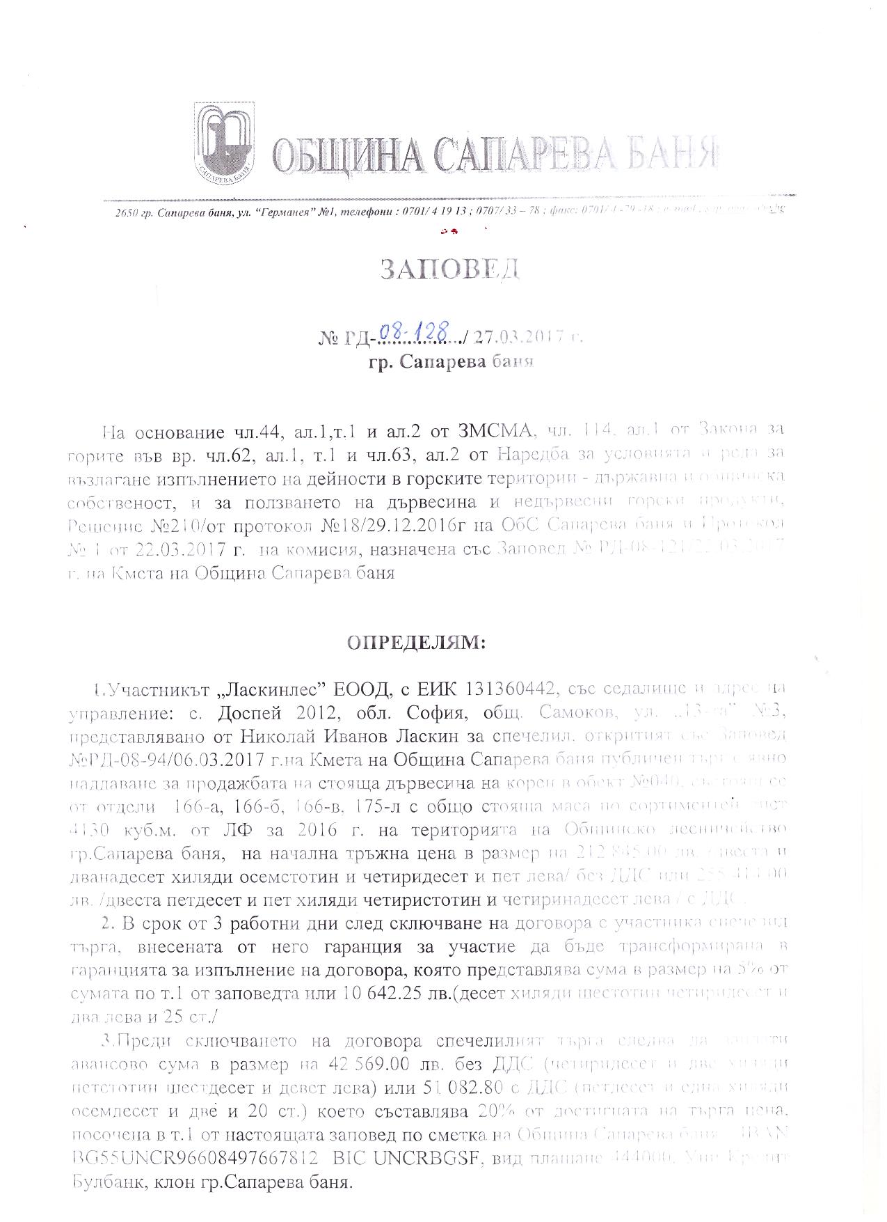 Заповед №РД-08- 128/27.03.2017г. на кмета на община Сапарева баня за обявяване на спечелил публичен търг за продажба на стояща дървесина в обект №040, състоящ се от отдели 166-а, 166-б, 166-в, 175-л