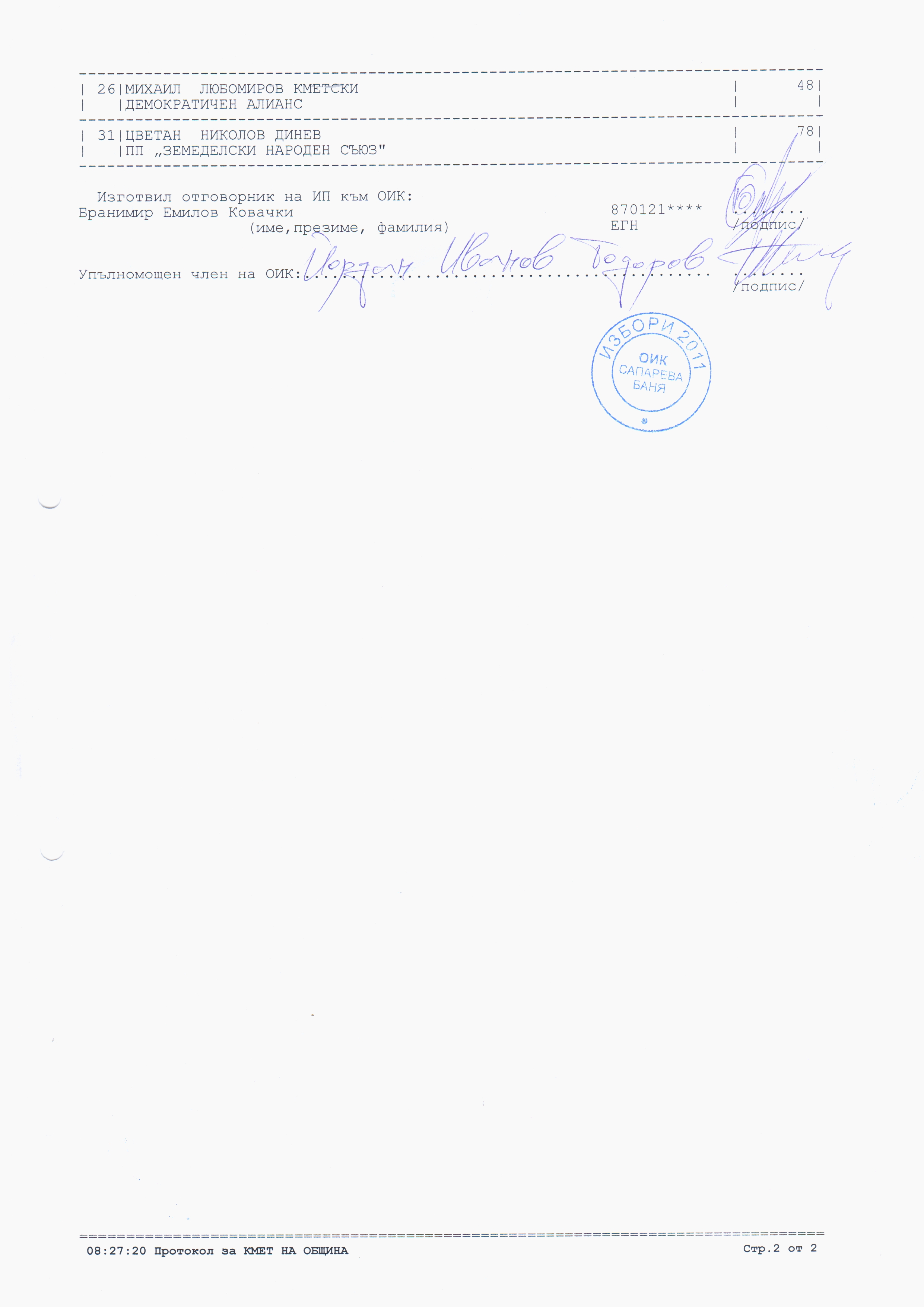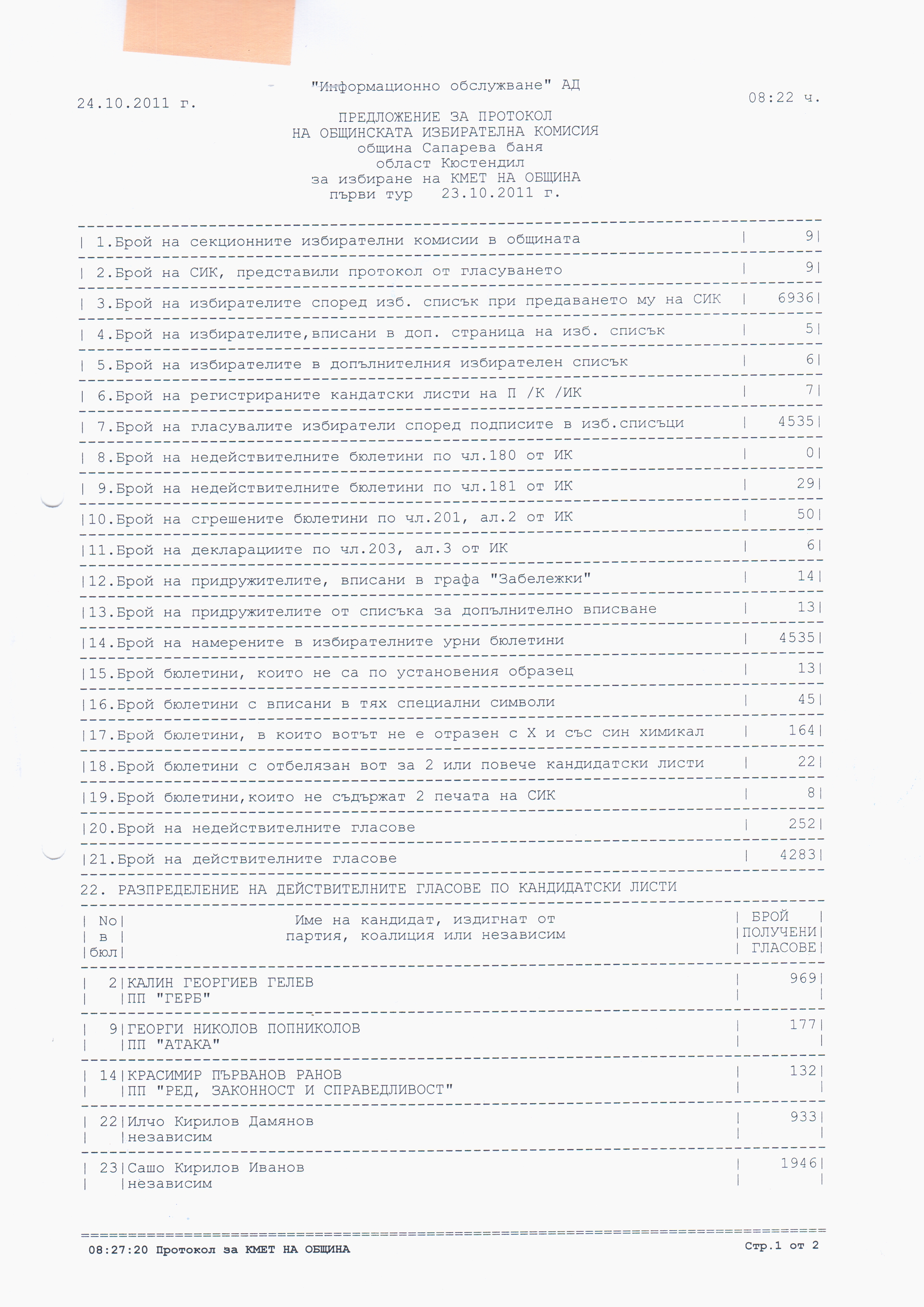 Протокол за избиране на кмет на Община Сапарева баня, първи тур