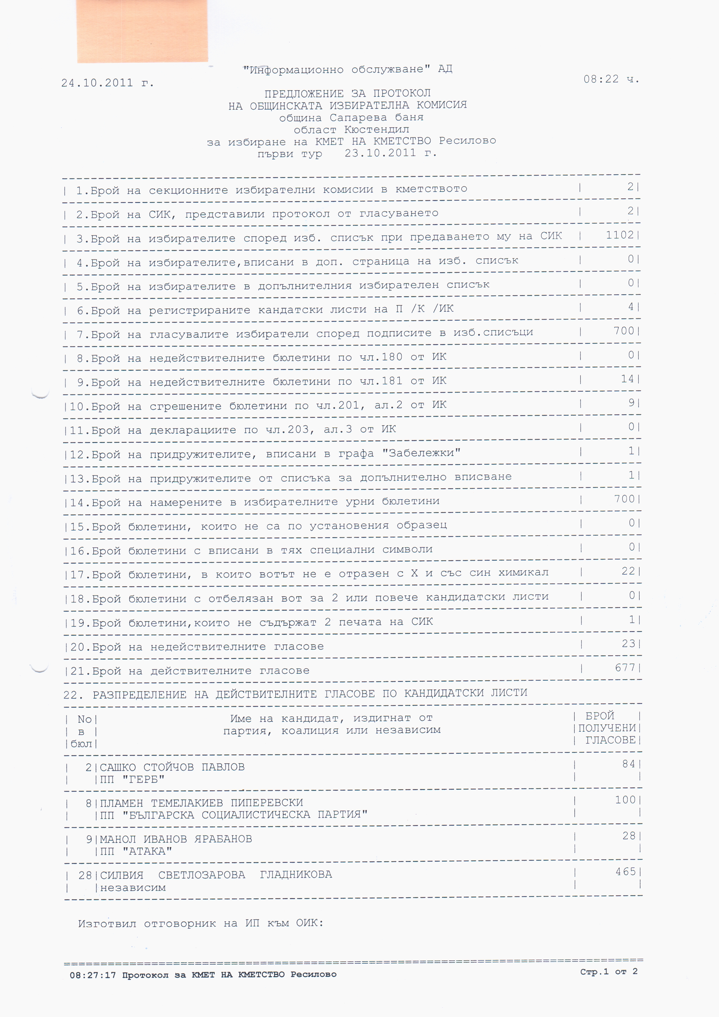 Протокол за избиране на кмет на Кметство Ресилово