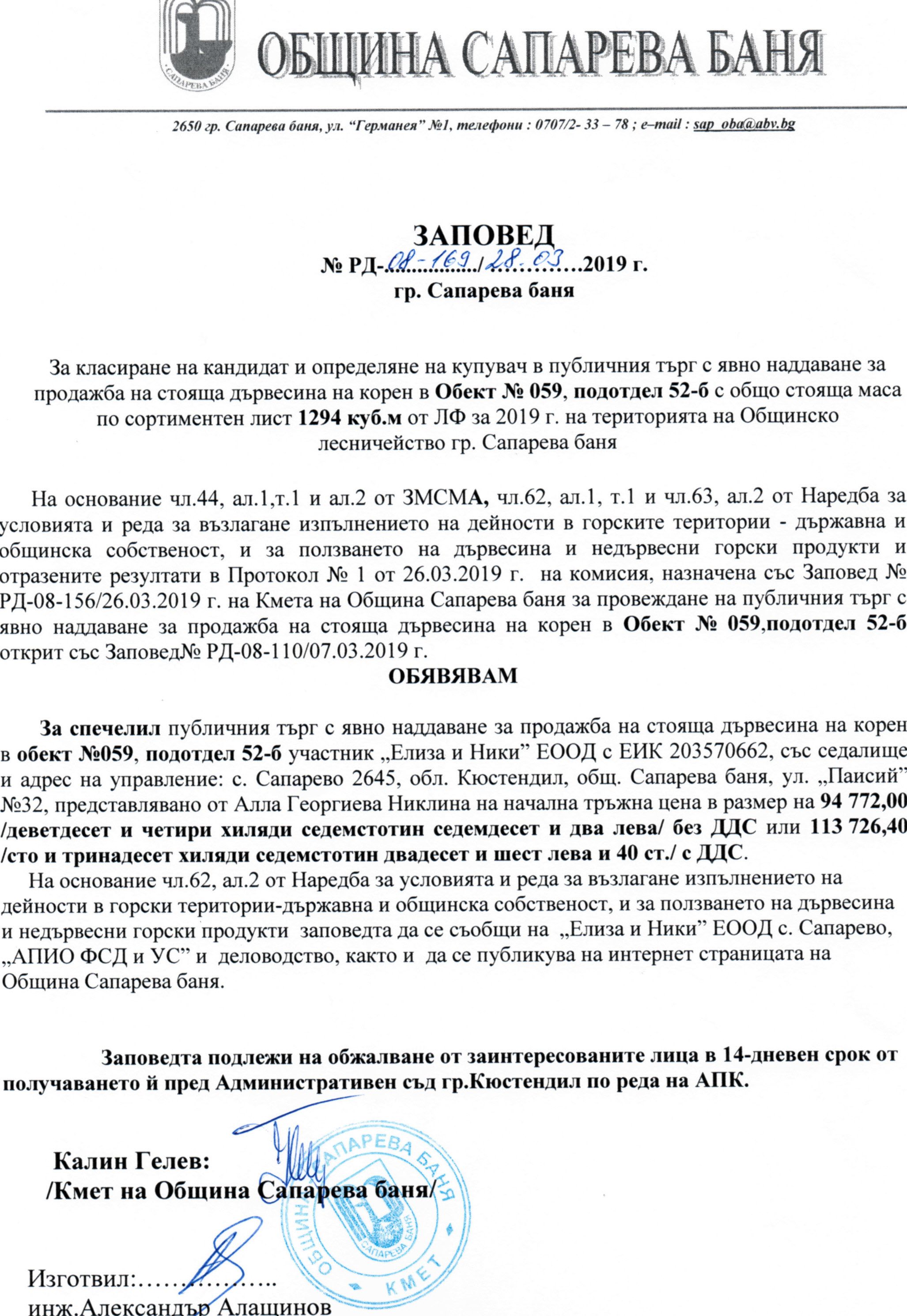 Протокол от работата на комисия и Заповед на кмета на община Сап. баня за спечелил открит публичен търг с явно наддаване за продажба на стояща дървесина на корен в обект №059,подотдел 52 „б"