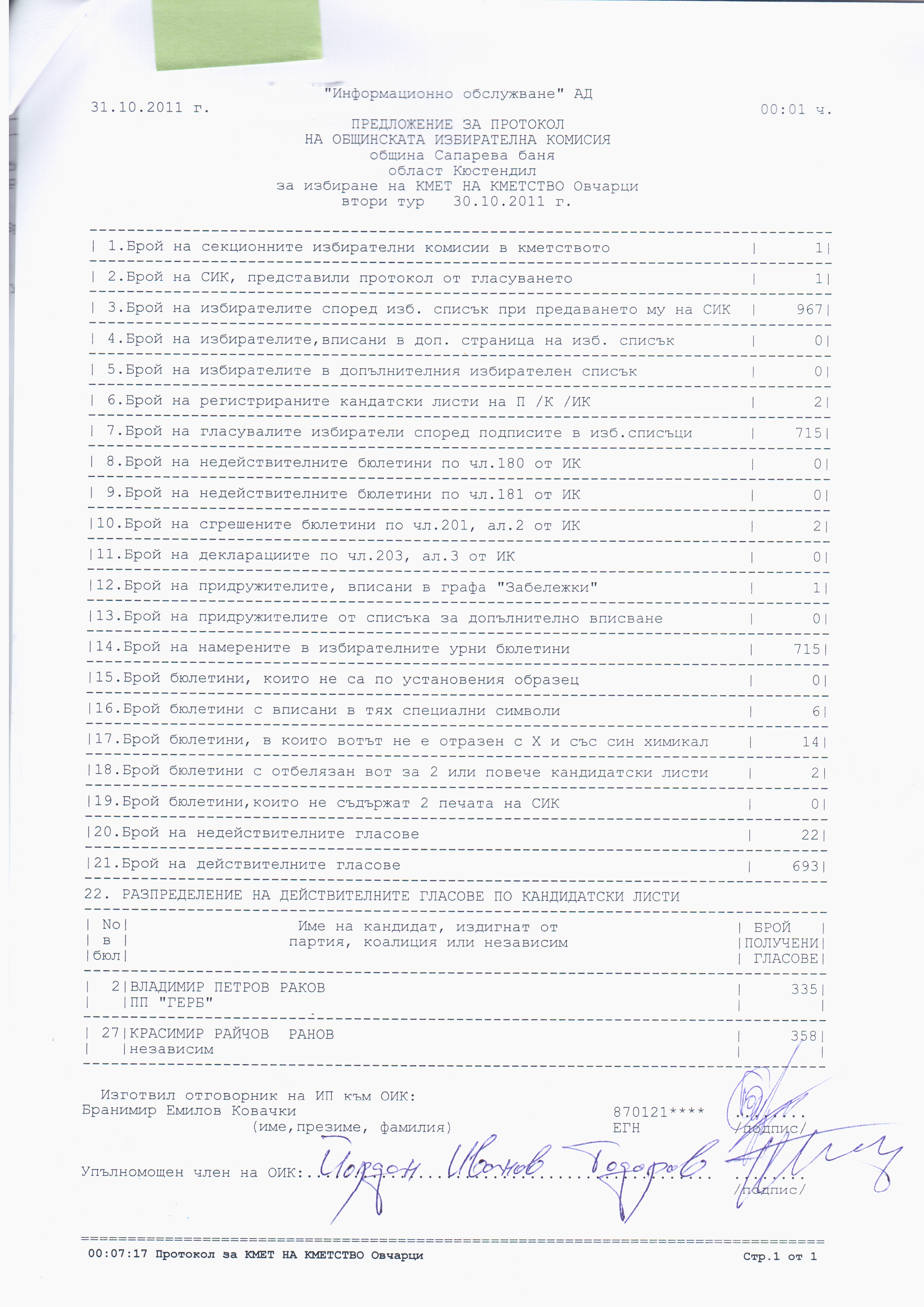 Протокол за избиране на кмет на Кметство Овчарци
