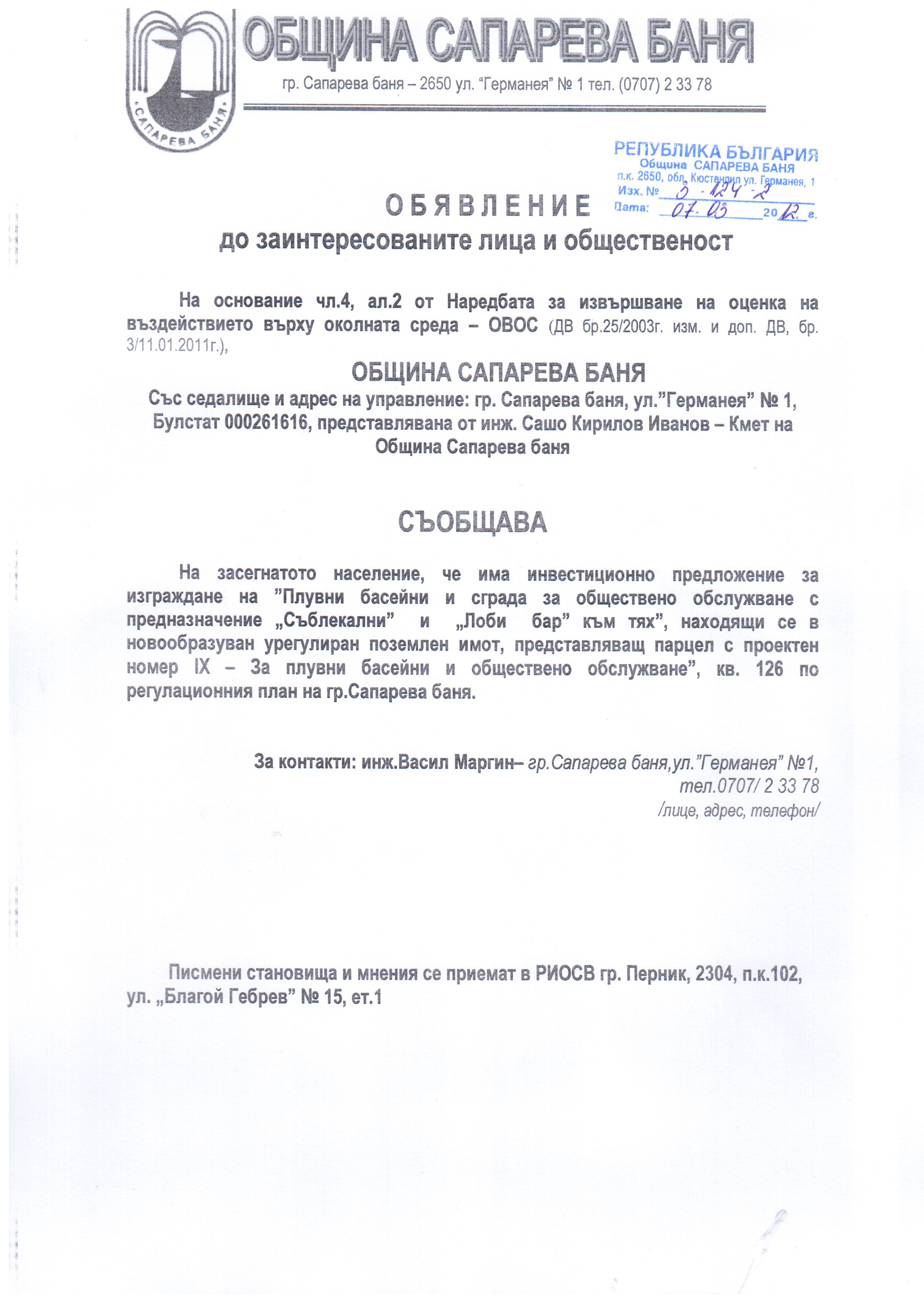 На основание чл. 4, ал. 2 от Наредбата за условията и реда за извършване на оценка на въздействието върху околната среда (ДВ бр.25/2003г. изм. и доп. ДВ, бр. 3/11.01.2011г.), Община Сапарева баня, със седалище и адрес на управление: гр.Сапарева баня, ул."Германея" №1, представлявана от Кмет инж. Сашо Кирилов Иванов съобщава на засегнатото население, че има инвестиционно намерение за изграждане на "Плувни басейни и сграда за обществено обслужване с предназначение „Съблекални" и „Лоби бар" към тях", находящи се в новообразуван урегулиран поземлен имот, представляващ парцел с проектен номер ІХ - За плувни басейни и обществено обслужване", кв. 126 по регулационния план на гр.Сапарева баня.