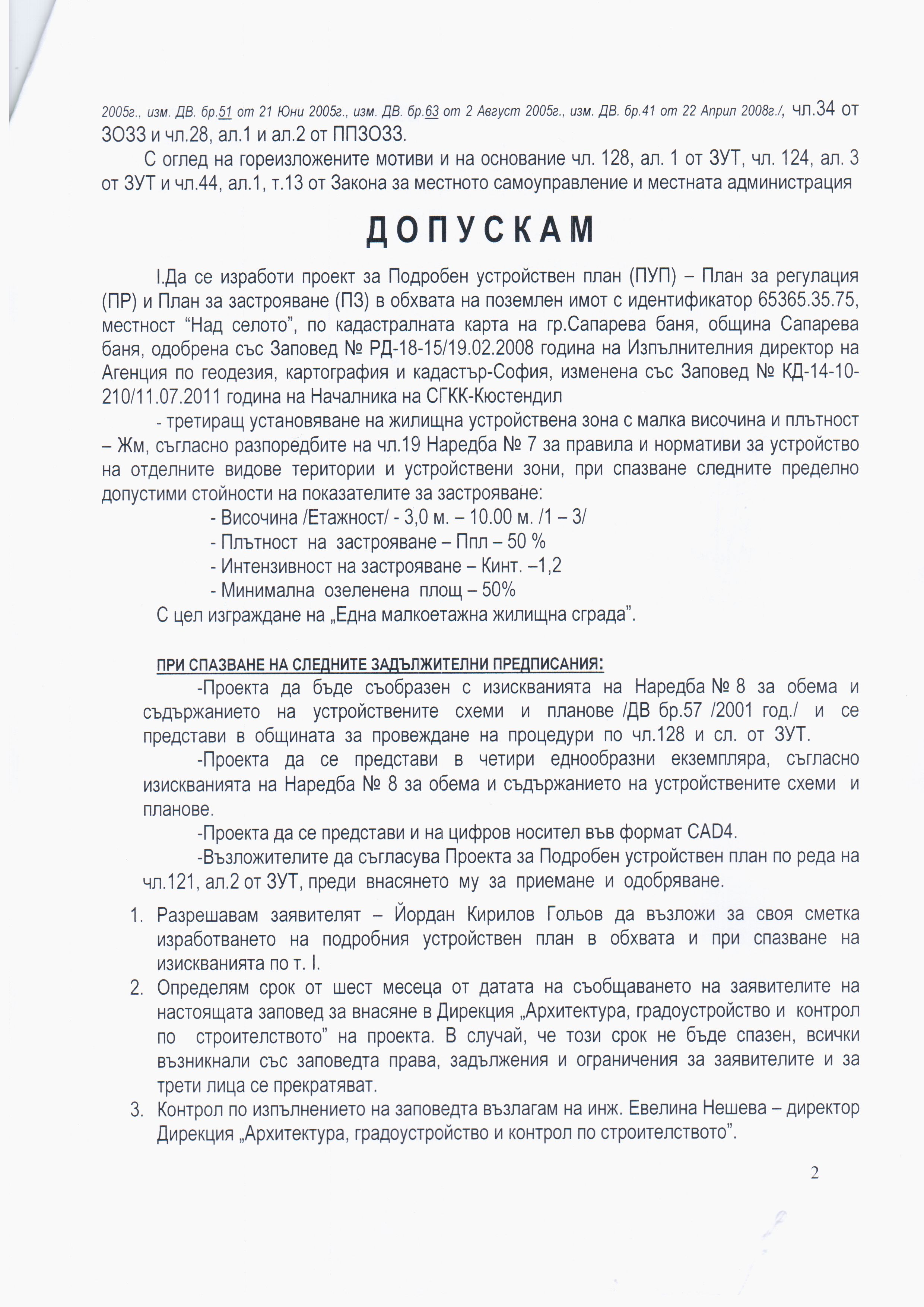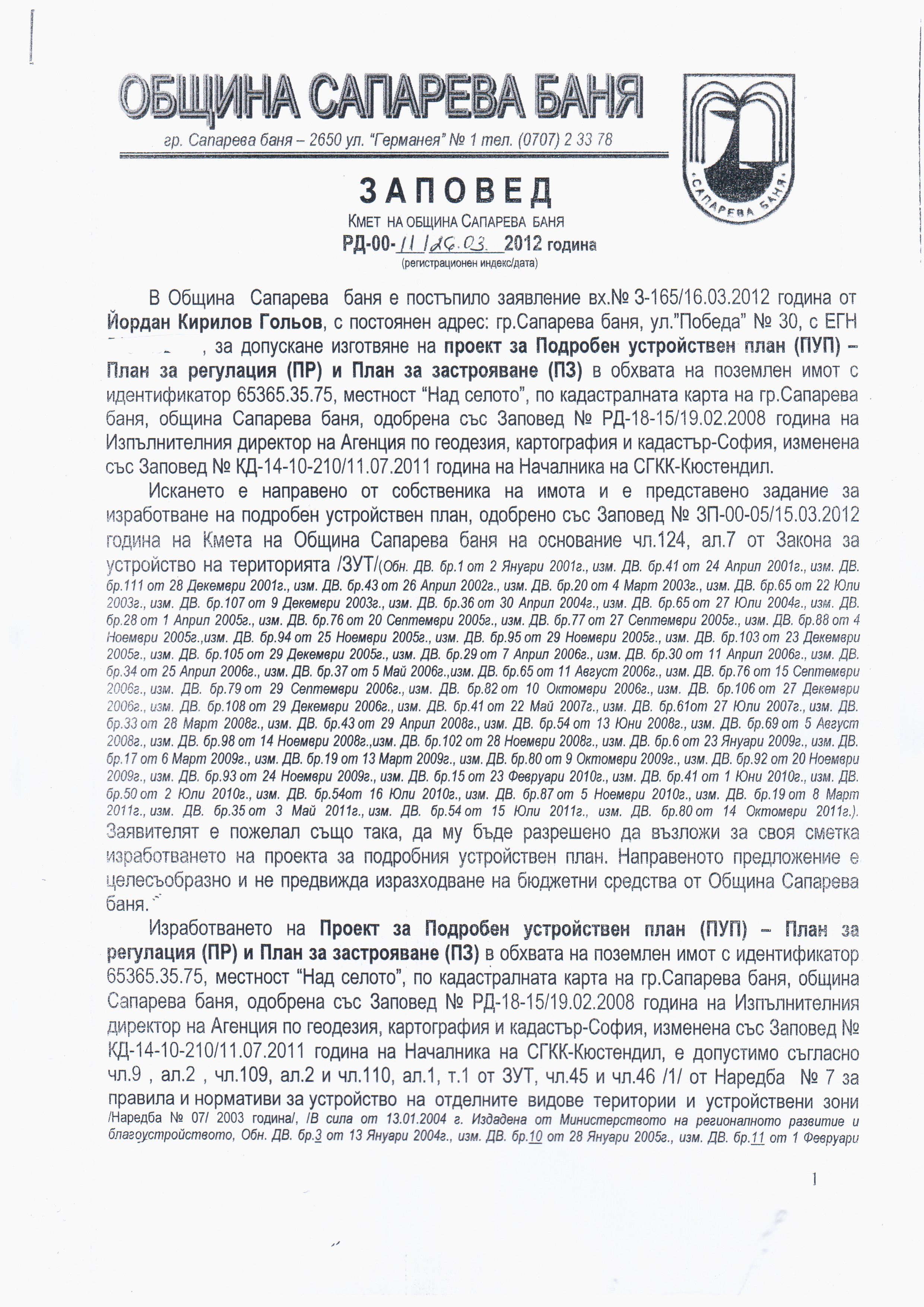 Община Сапарева баня на основание чл.128, ал.1 от Закона за устройство на територията /ЗУТ/ обявява на всички заинтересовани лица, че е издадена Заповед № РД-00-11/26.03.2012 година на Кмета на Община Сапарева баня за допускане изготвяне на Проект за Подробен устройствен план (ПУП) - План за регулация (ПР) и План за застрояване (ПЗ) в обхвата на поземлен имот с идентификатор 65365.35.75, местност "Над селото", по кадастралната карта на гр.Сапарева баня, община Сапарева баня, третиращ промяна предназначението на земеделска земя за собствени неземеделски нужди - установяване на жилищна устройствена зона с малка височина и плътност - Жм, с цел изграждане на една малкоетажна жилищна сграда, с Възложител Йордан Кирилов Гольов.