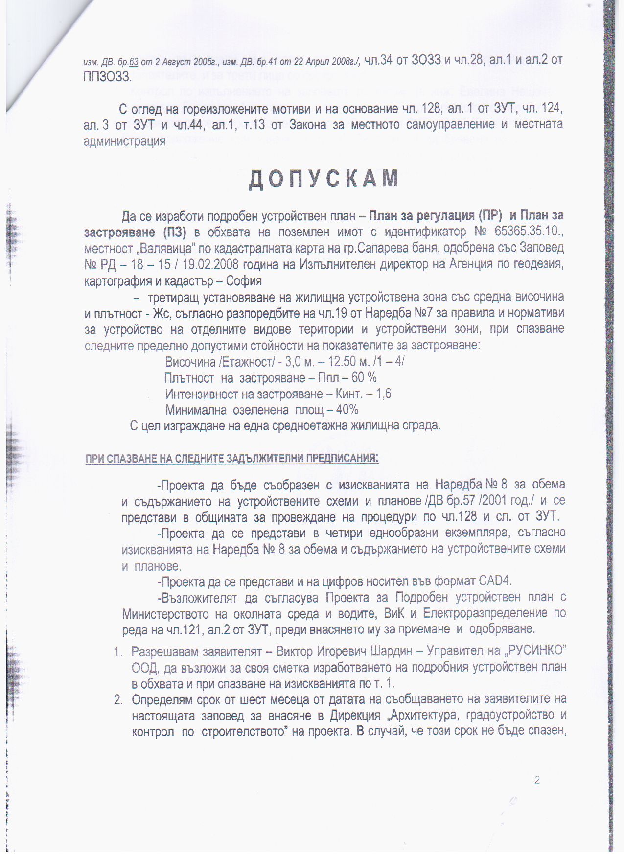 На основание чл. 128, ал.1 от Закона за устройство на територията, Община Сапарева баня съобщава за постановена на 27.06.2012 г. Заповед № РД - 00 - 25 / 2012 г. на Кмета на Община Сапарева баня за допускане изработването на проект на Подробен устройствен план /ПУП/ - План за регулация /ПР/ и План за застрояване /ПЗ/ в обхвата на поземлен имот с идентификатор № 65365.35.10, местност „Валявица" по кадастралната карта на гр. Сапарева баня, третиращ промяна предназначението на земеделска земя за собствени неземеделски нужди, установяване на жилищна устройствена зона със средна височина и плътност - Жс, с цел изграждане на една средноетажна жилищна сграда, с Възложител „РУСИНКО" ООД представлявано от Управител Виктор Игоревич Шардин.
