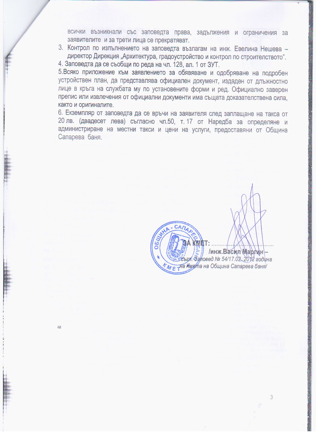 Заповедта е поставена за обществен достъп на информационното табло на Община Сапарева баня на 28.06.2012 г. и подлежи на обжалване по реда на чл.215 от ЗУТ. Достъпна е в прикачените файлове.