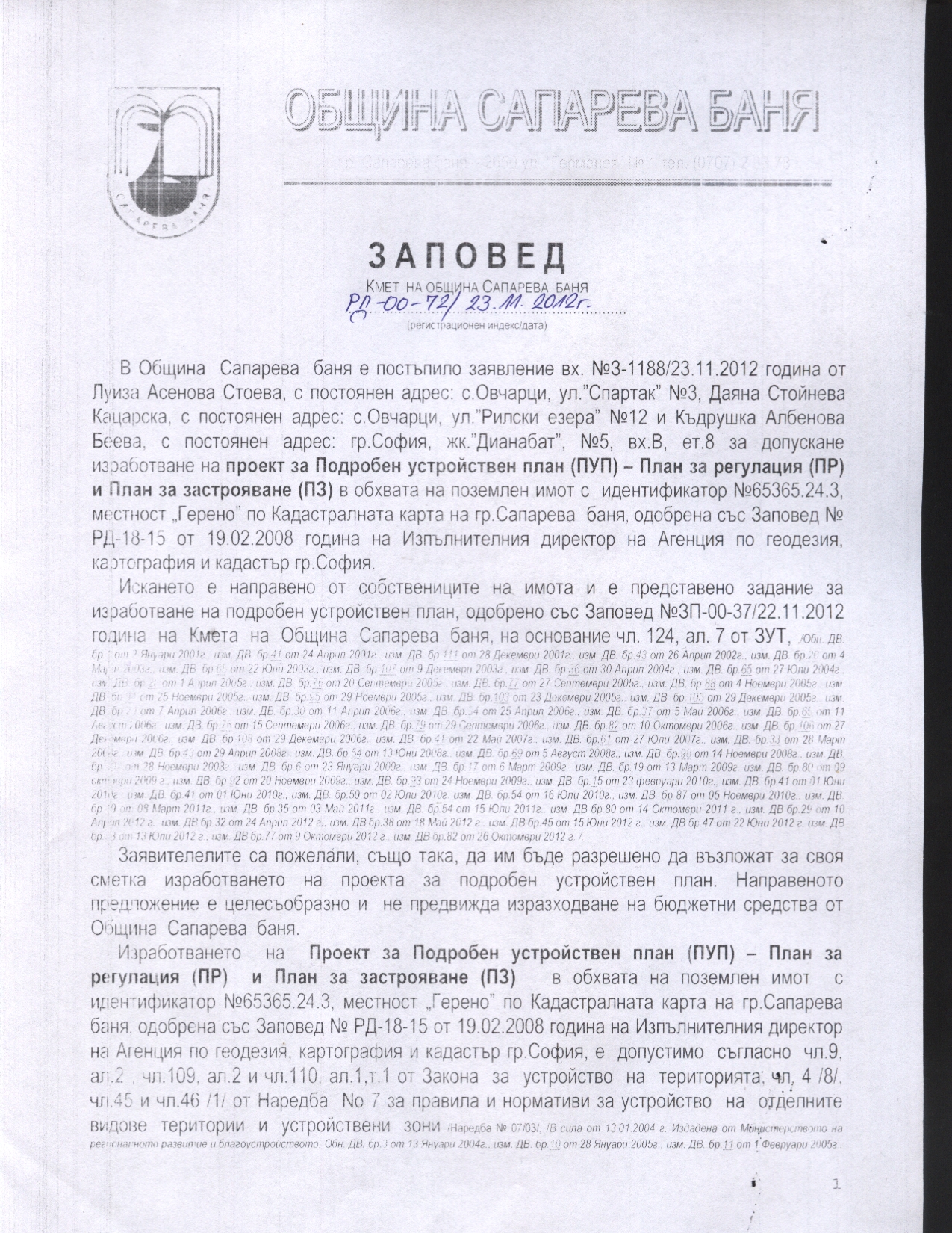 Община Сапарева баня на основание чл.128, ал. 1 от ЗУТ обявява на всички заинтересовани лица, че е издадена Заповед №РД-00-72/23.11.2012 година на Кмета на Община Сапарева баня за допускане изготвянето на Проект за Подробен устройствен план - План за регулация (ПР) и План за застрояване (ПЗ) в обхват поземлен имот с идентификатор 65365.24.3, месност «Герено» по Кадастралната карта на гр.Сапарева баня, третиращ промяна на предназначението на земеделска земя за неземеделски нужди, установяване на жилищна устройствена зона с преобладаващо застрояване с малка височина и плътност - Жм, с цел изграждане на една малкоетажна сграда за настаняване на туристи", Възложители Луиза Асенова Стоева, Даяна Стойнева Кацарска и Къдрушка Албенова Беева.
