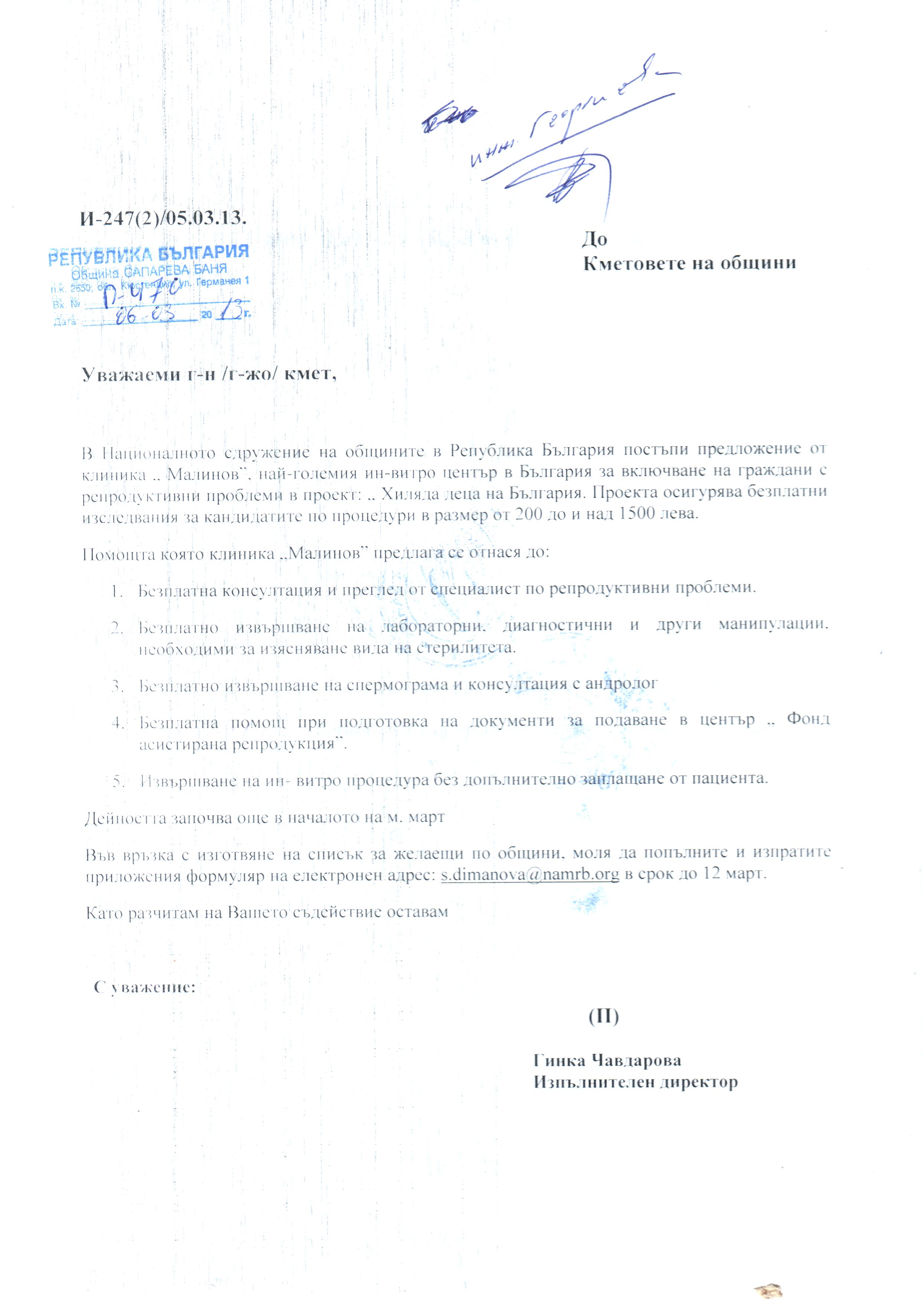 Предложение от страна на Клиника Малинов за включване на граждани с репродуктивни проблеми в проект: Хиляда деца на България