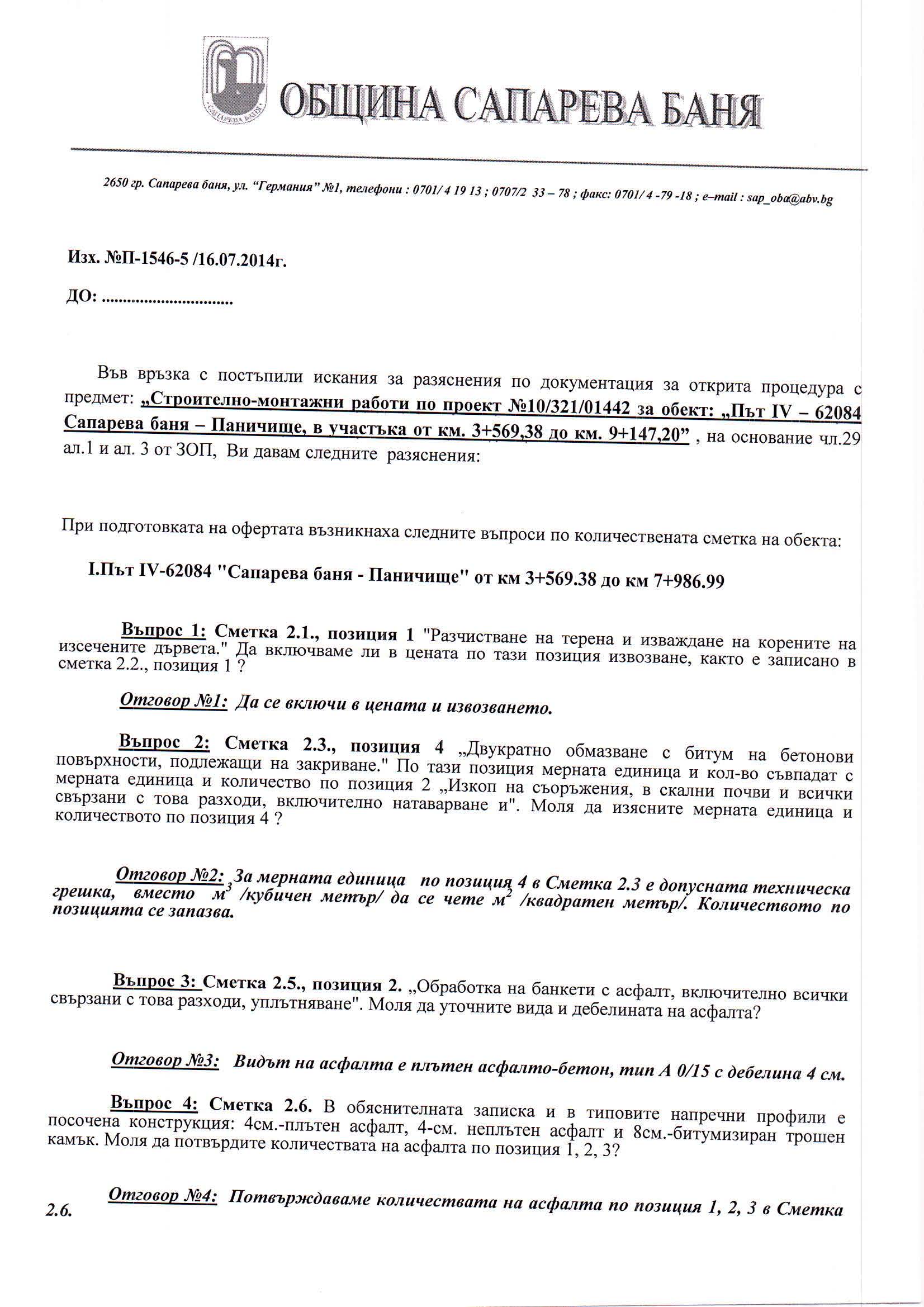 Разяснения с изх. №П-1546-5/16.07.2014г.на кмета на община Сапарева баня за публикувана в АОП обществена поръчка 00761-2014-0005 / СМР път Паничище/