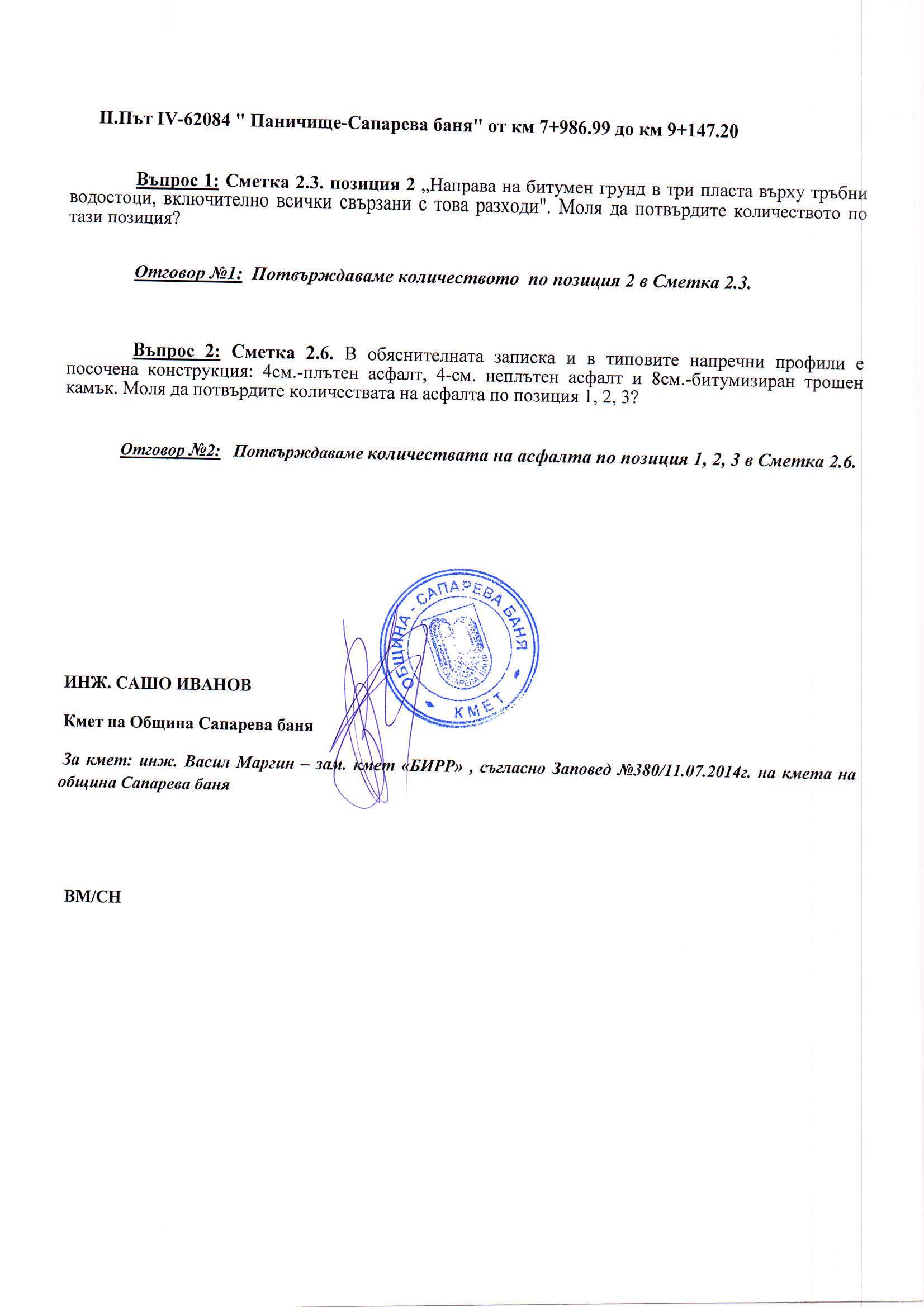 Във връзка с постъпили искания за разяснения по документация за открита процедура с предмет: „Строително-монтажни работи по проект №10/321/01442 за обект: „Път ІV - 62084 Сапарева баня - Паничище, в участъка от км. 3+569,38 до км. 9+147,20" , на основание чл.29 aл.1 и ал. 3 от ЗОП, Ви давам следните разяснения: