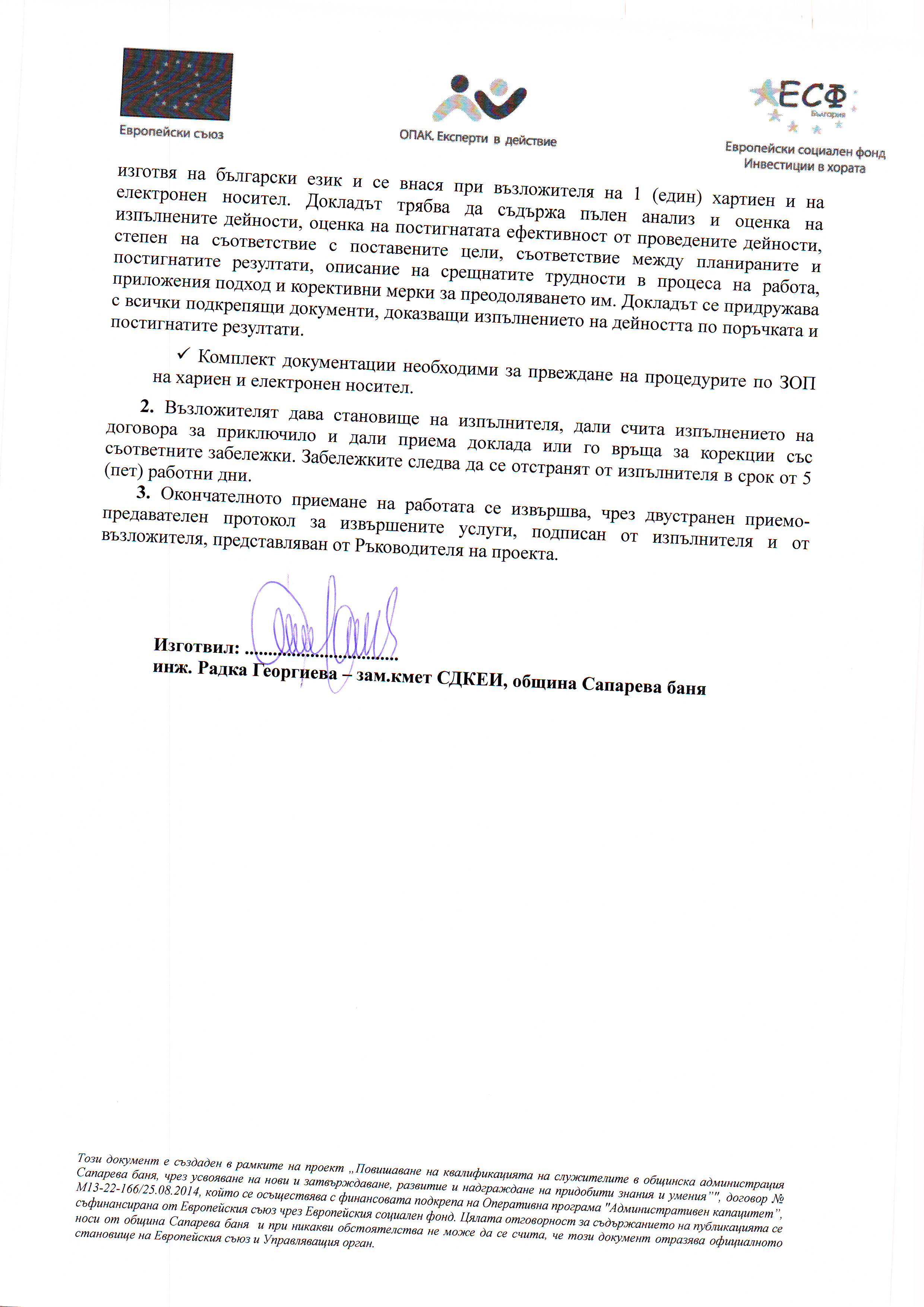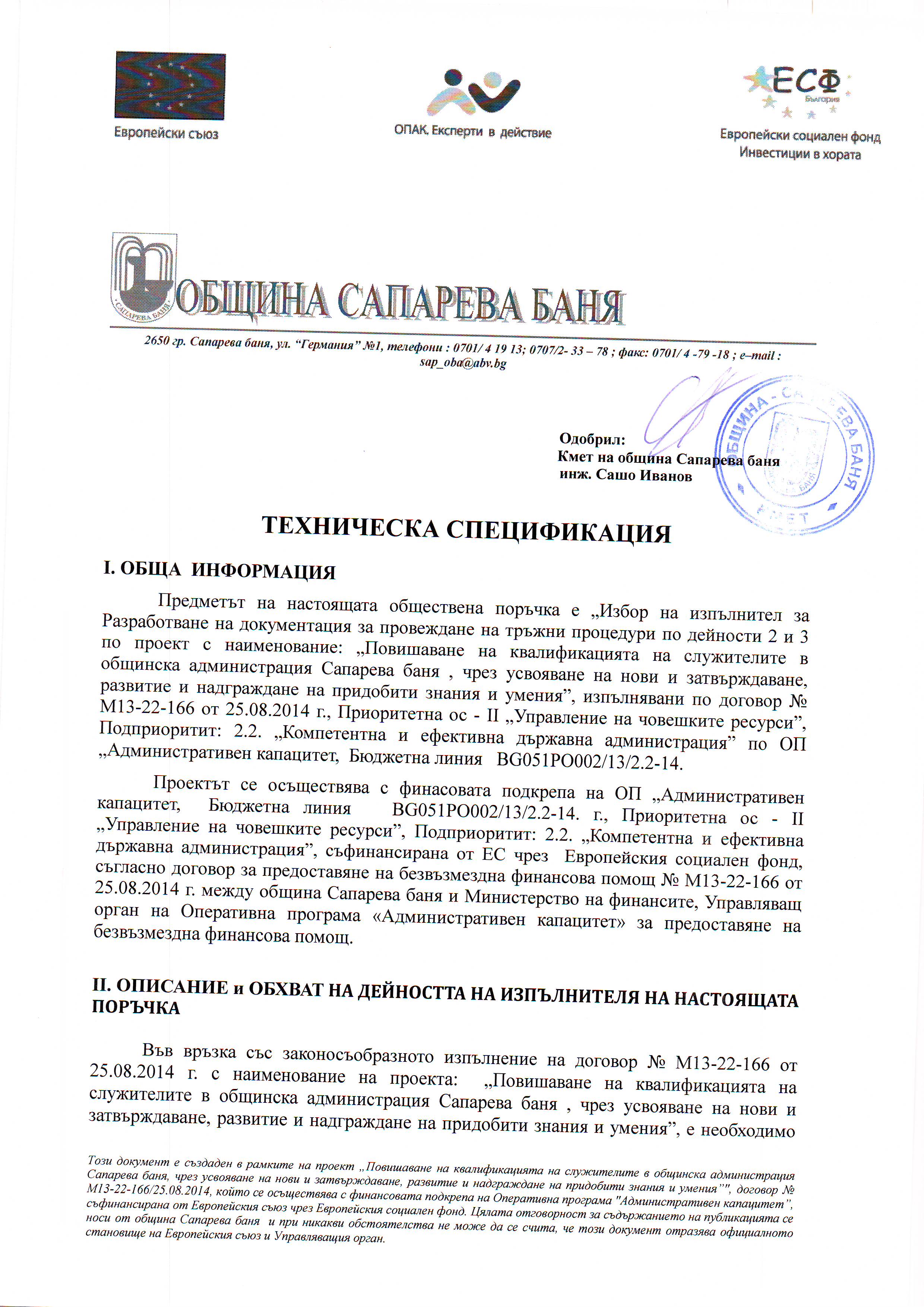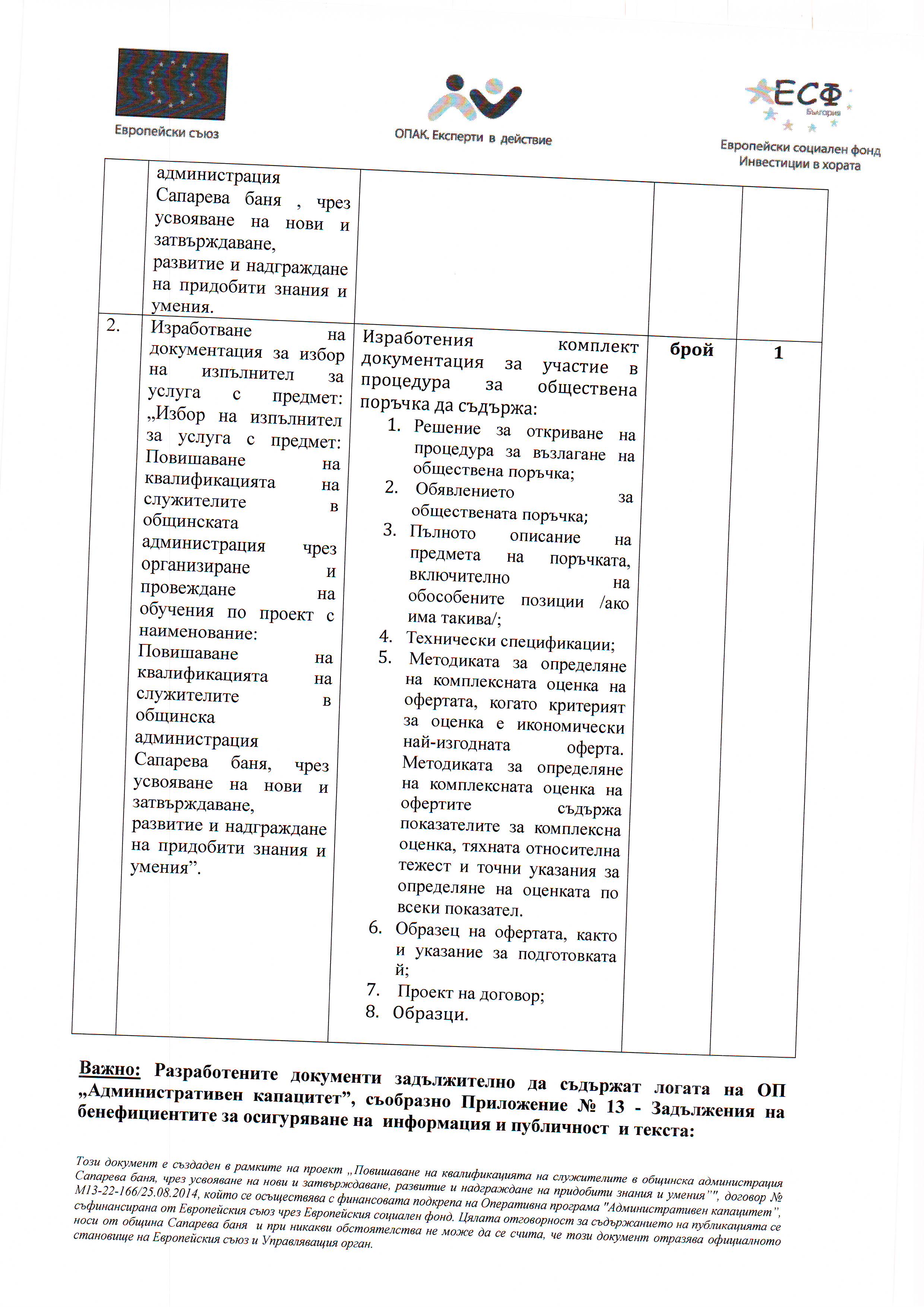 Публична покана с предмет:„Избор на изпълнител за разработване на документация за провеждане на тръжни процедури по дейности 2 и 3 по проект с наименование: „Повишаване на квалификацията на служителите в общинска администрация Сапарева баня