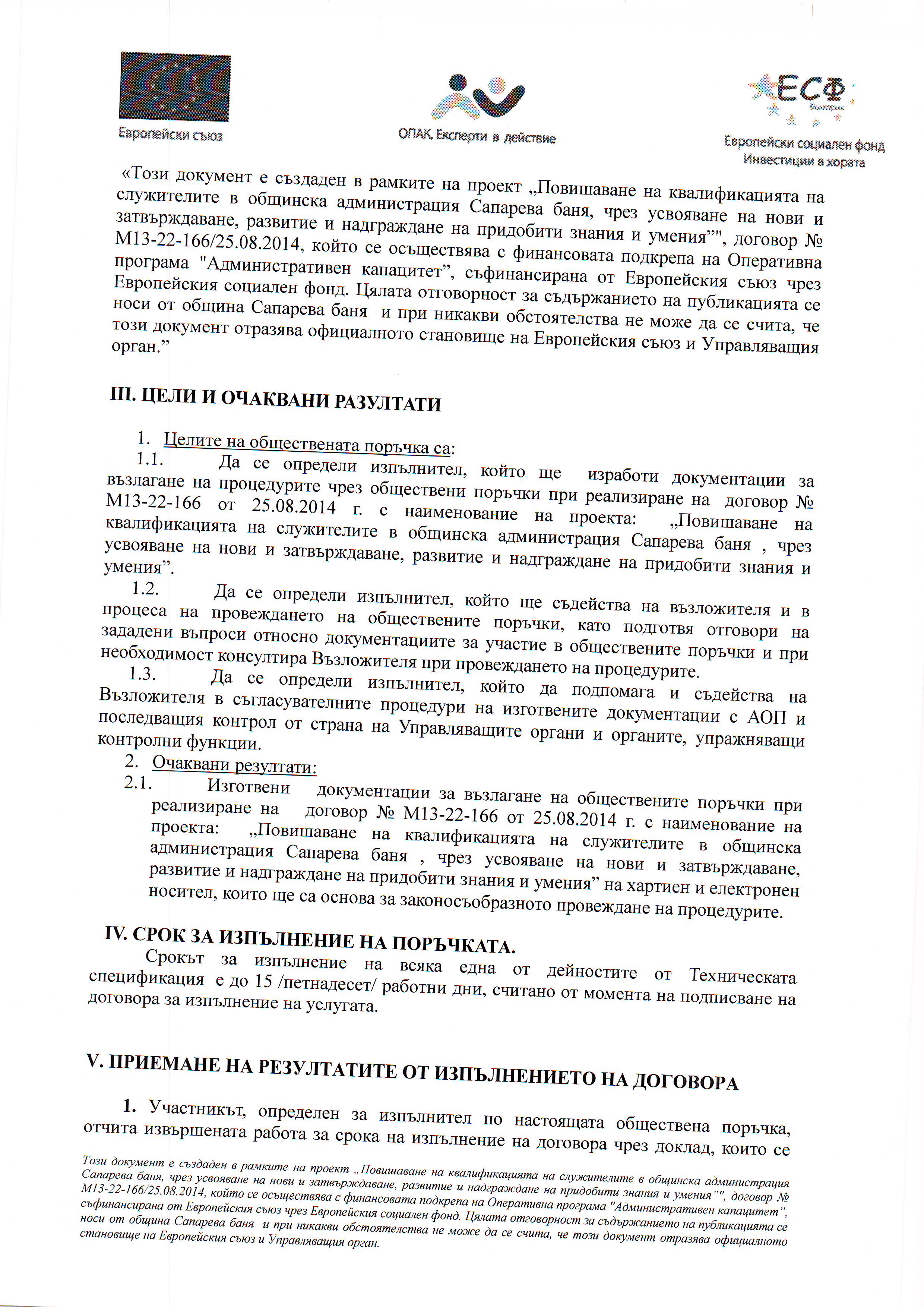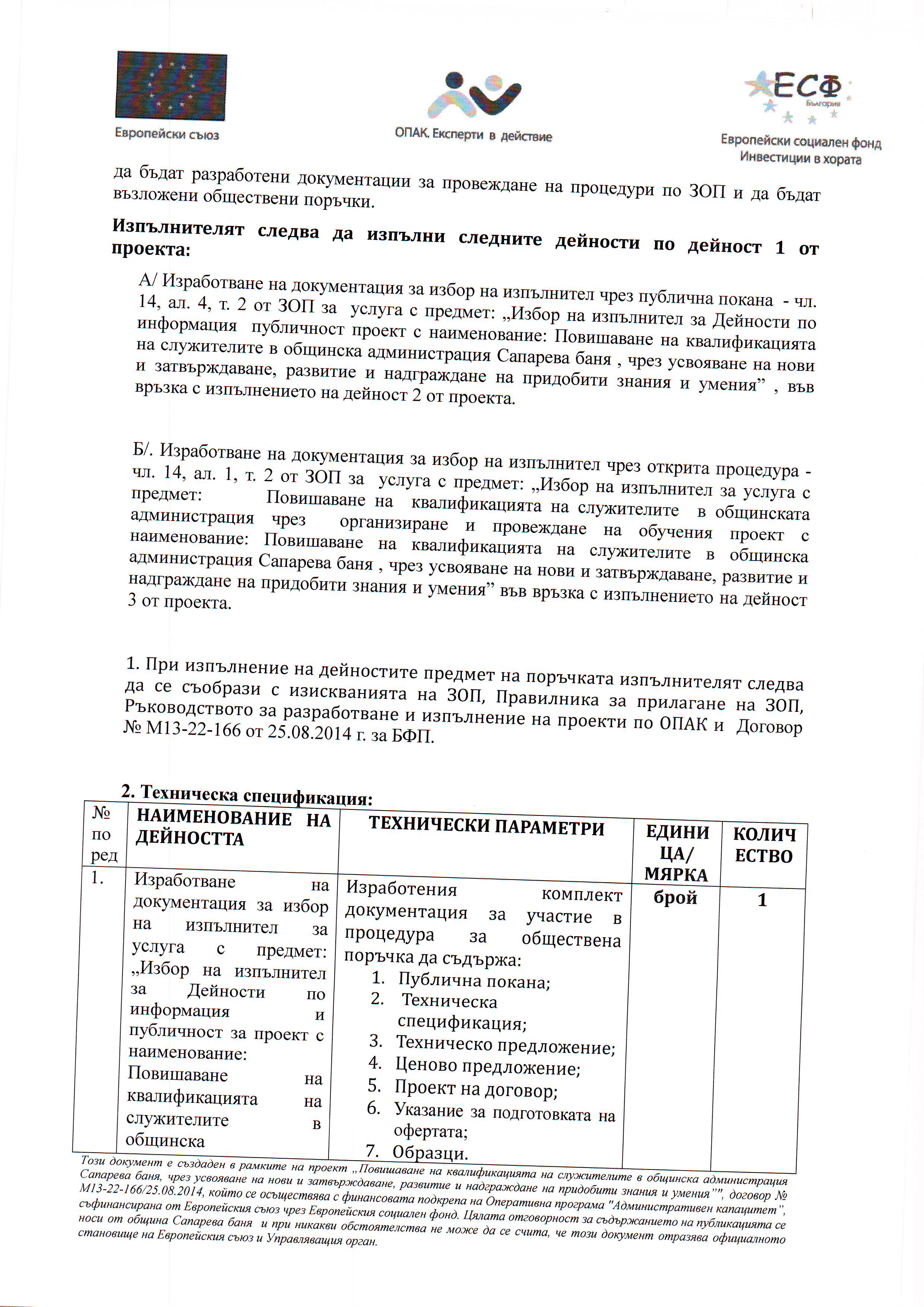 На портала на Агенцията за обществени поръчки е публикувана публична покана по реда на Глава осма "a" на Закона за обществените поръчки за възлагане на обществена поръчка чрез публична покана за услуга с предмет: „Избор на изпълнител за Разработване на документация за провеждане на тръжни процедури по дейности 2 и 3 по проект с наименование: „Повишаване на квалификацията на служителите в общинска администрация Сапарева баня , чрез усвояване на нови и затвърждаване, развитие и надграждане на придобити знания и умения", изпълнявани по договор за БФП № М13-22-166 от 25.08.2014 г., Приоритетна ос - ІІ „Управление на човешките ресурси", Подприоритeт: 2.2. „Компетентна и ефективна държавна администрация" по ОП „Административен капацитет, Бюджетна линия BG051PO002/13/2.2-14".