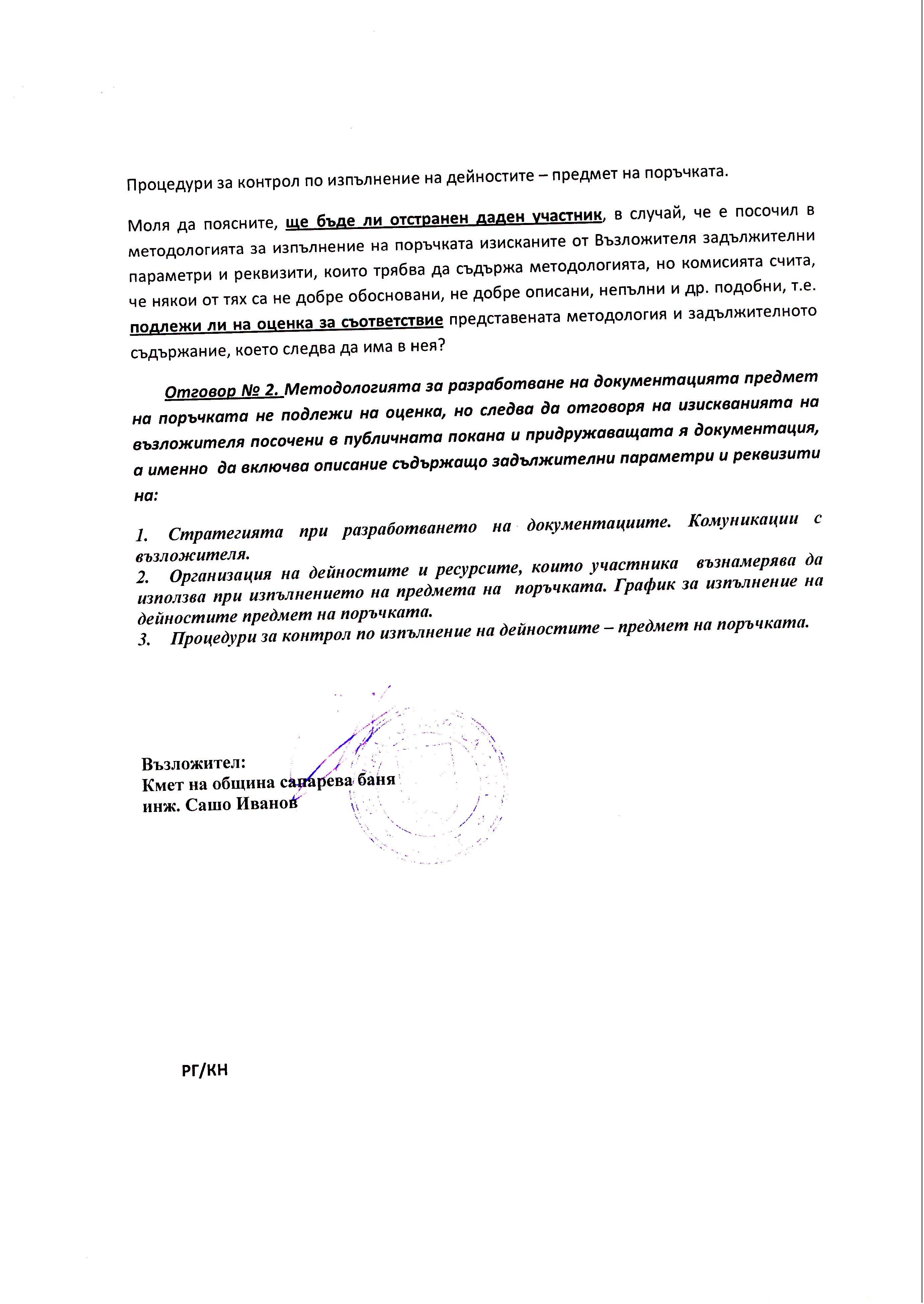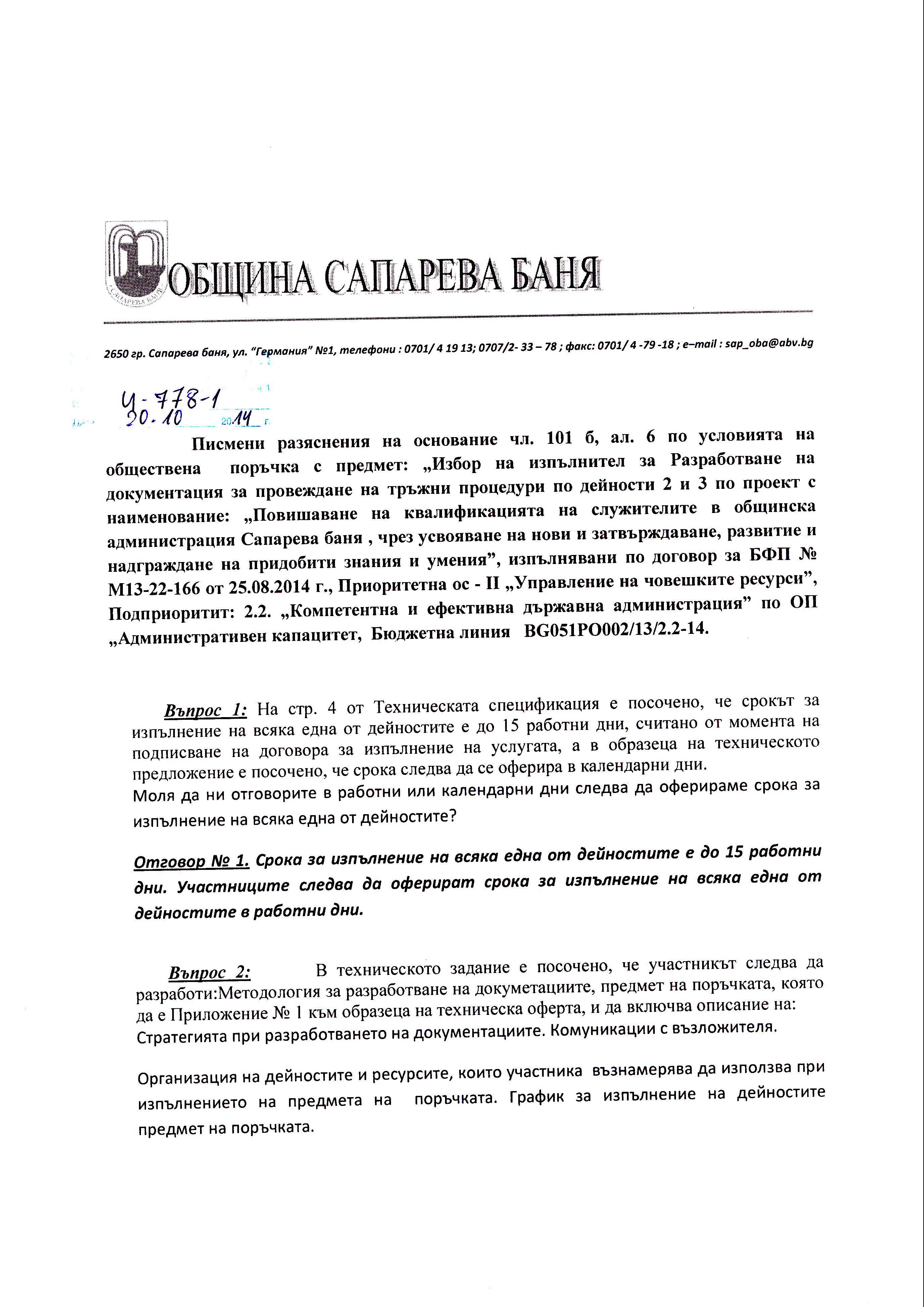 Разяснения с изх. №П-И-778-1/20.10.2014г. за публична покана за разработване на документация за провеждане на процедури по проект с наименование:„Повишаване на квалификацията на служителите в ОбА Сап. баня "