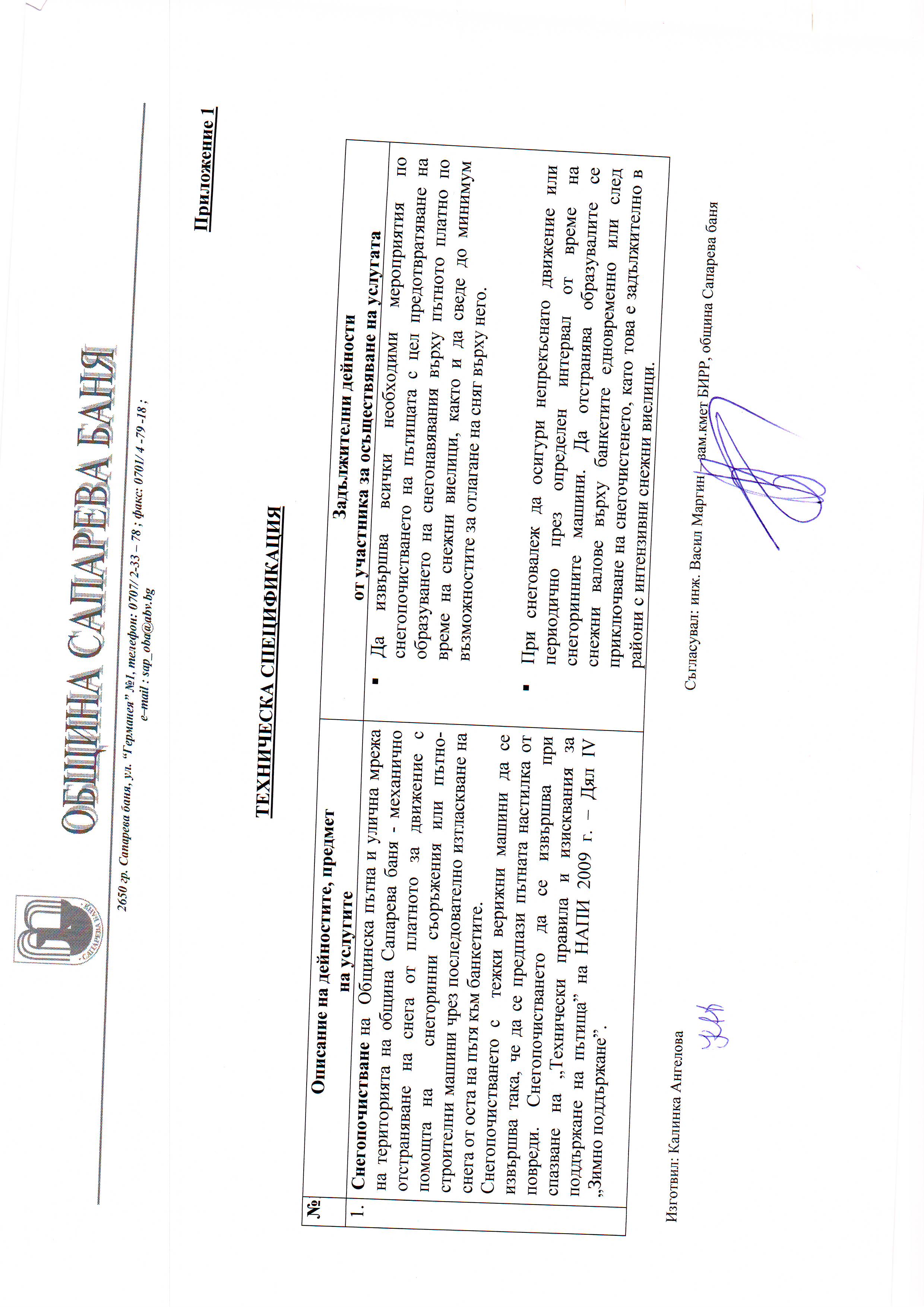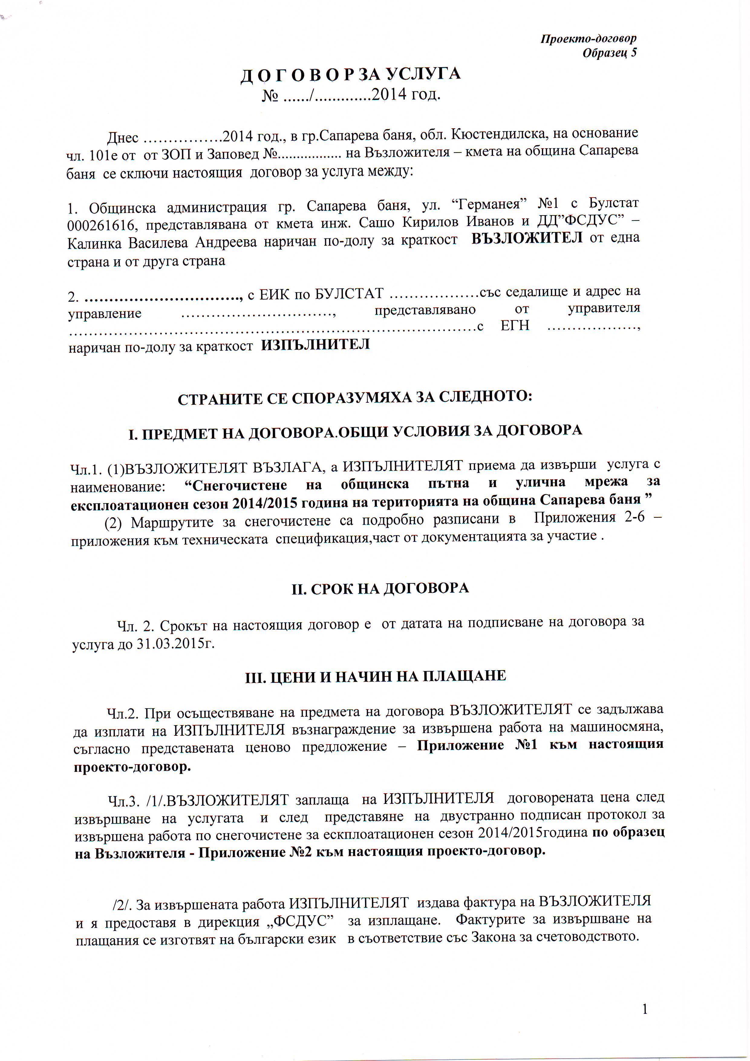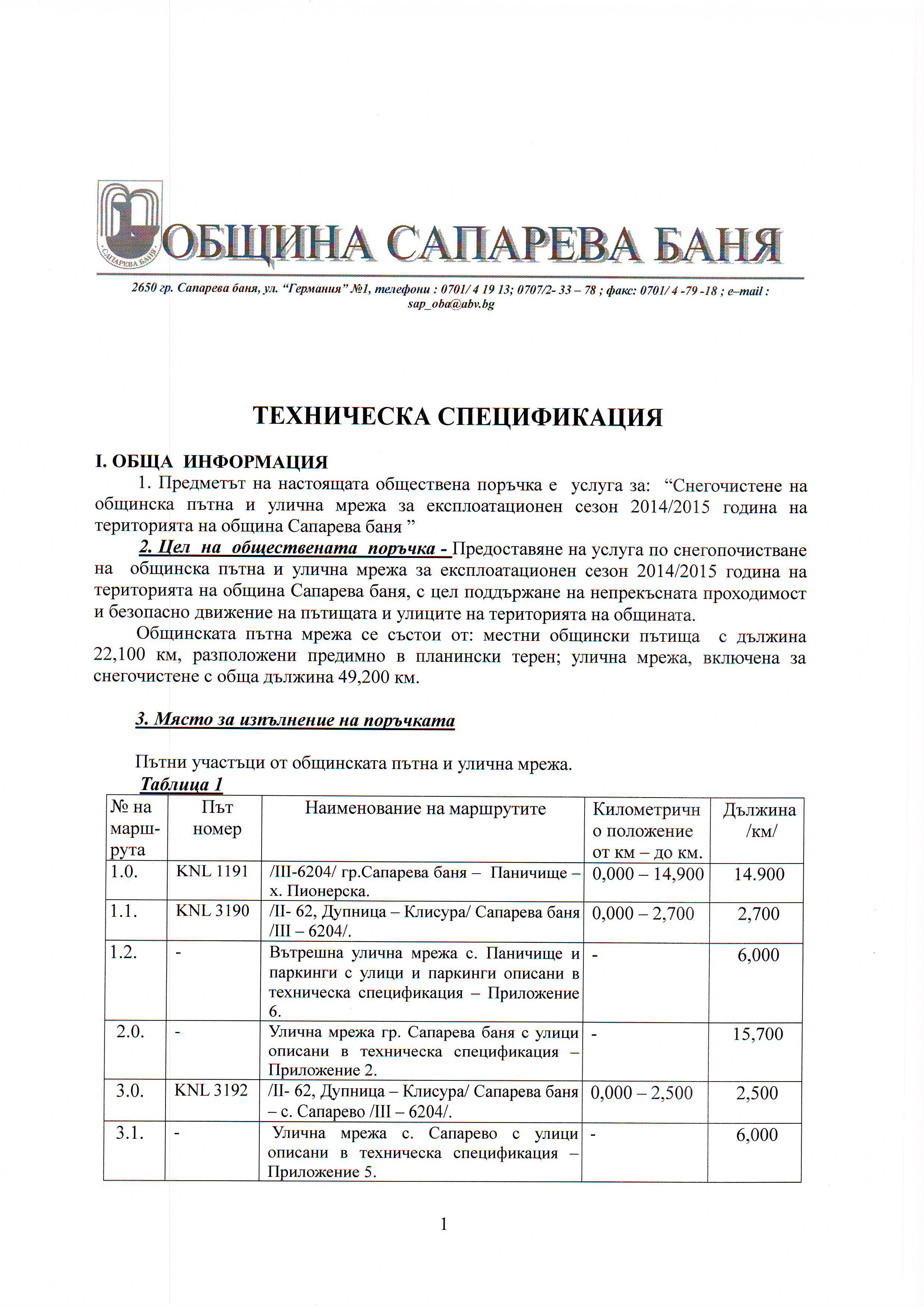 Публична покана с предмет: “Снегочистене на общинска пътна и улична мрежа за експлоатационен сезон 2014/2015 година на територията на община Сапарева баня ”